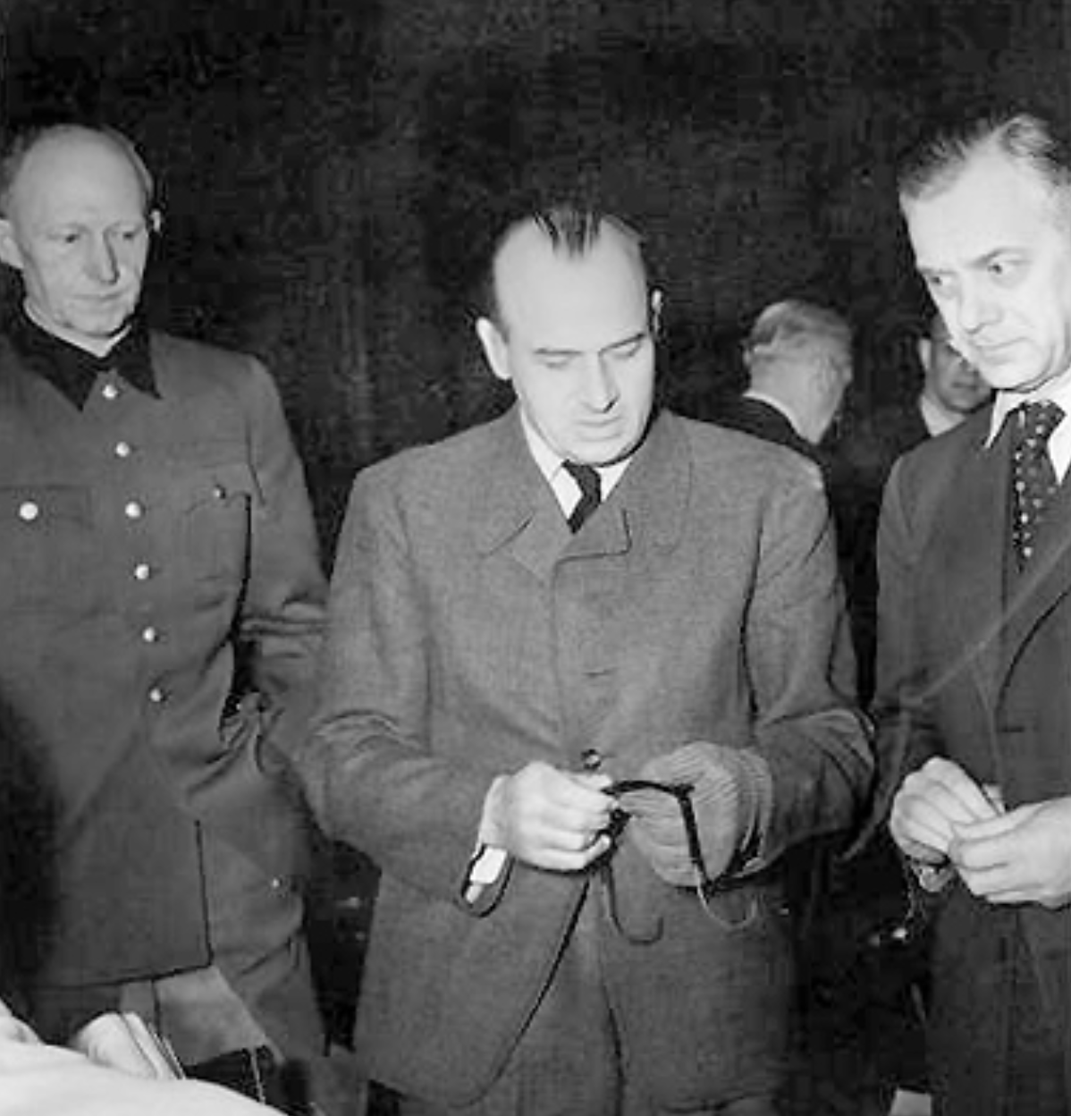 A 1945 photograph of three Nazi war criminals (L to R): Alfred Jodl (1890-1946), Chief of the Army's Operations Staff, Hans Frank (1900-1946), Nazi Chief in Poland, and Alfred Rosenberg (1893-1946), racial theorist and Reichs Minister. All three were found guilty at the Nuremberg trials (1945-6) and hanged for war crimes and crimes against humanity.