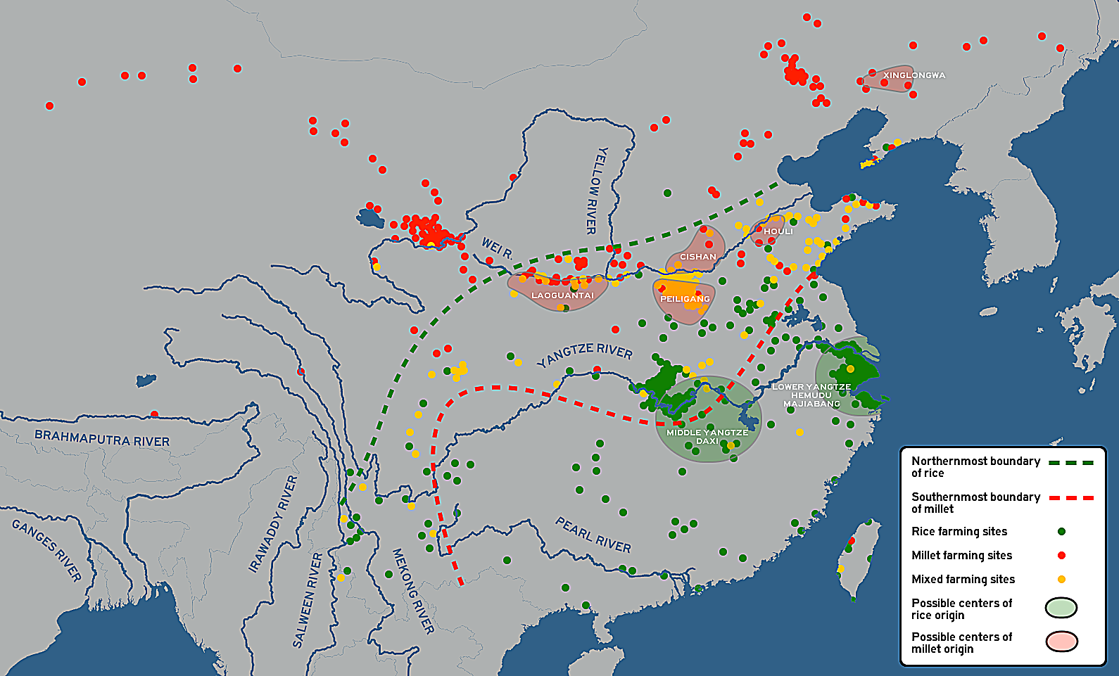 al., He et. "Possible Agricultural Centers in Prehistoric China." World History Encyclopedia, 17 Feb 2025, https://www.worldhistory.org/image/19994/possible-agricultural-centers-in-prehistoric-china/.