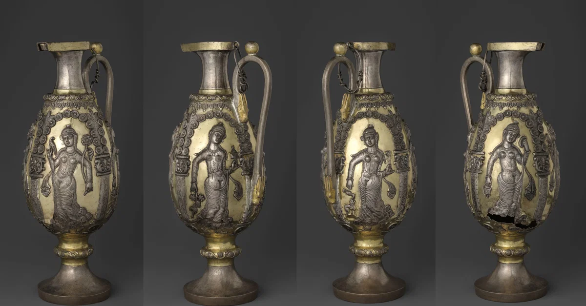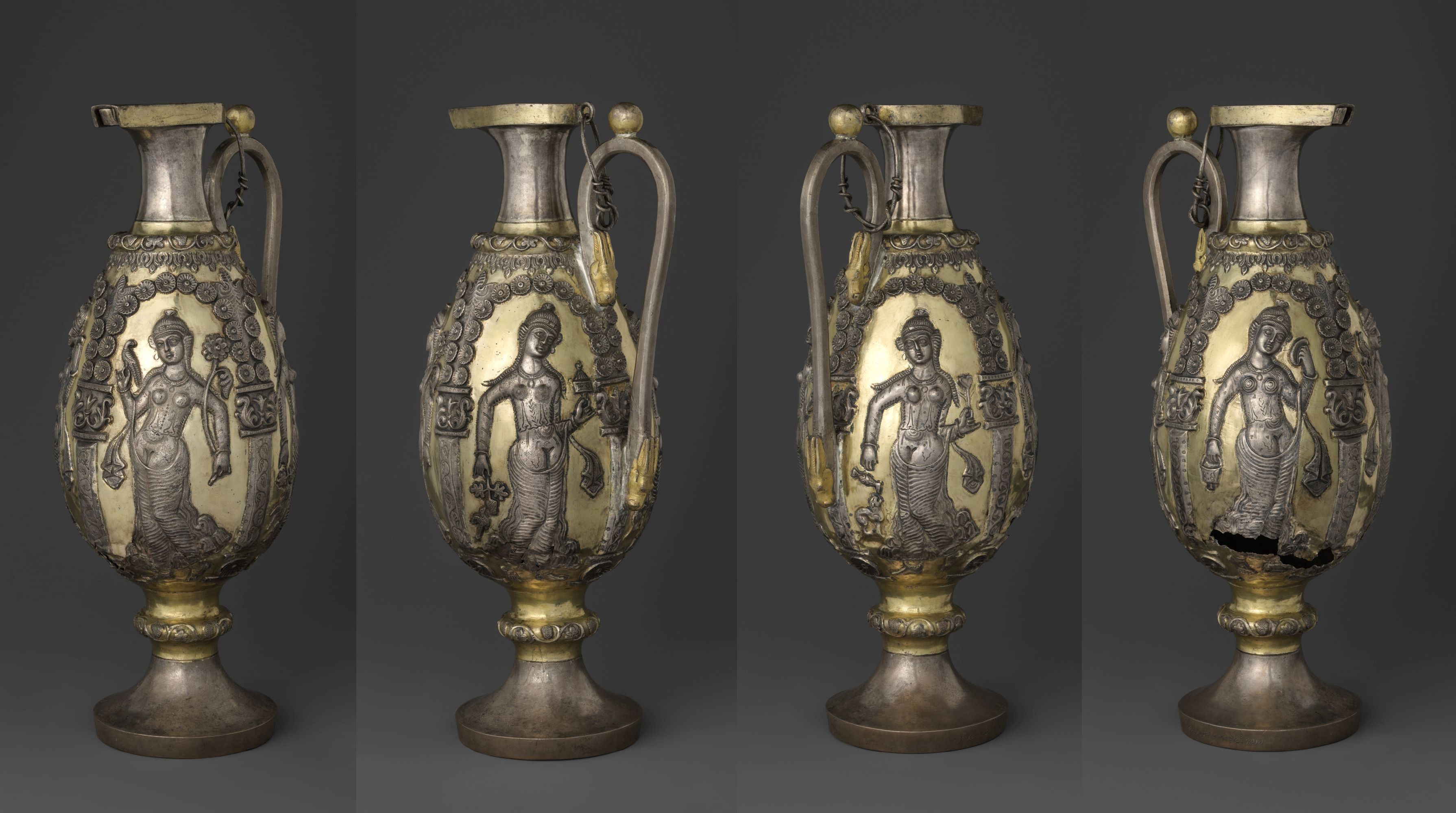 Four views of silver ewer with dancing women within arcades. Sassanian Empire, ca. 6th-7th century CE.