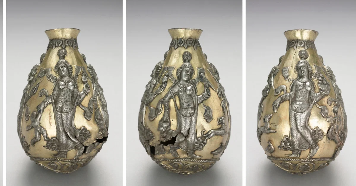 Four views of a Sassanian silver vessel with four female figures, from the Sassanian Empire (224-651 CE), modern-day Iran, c. 300-500 CE.