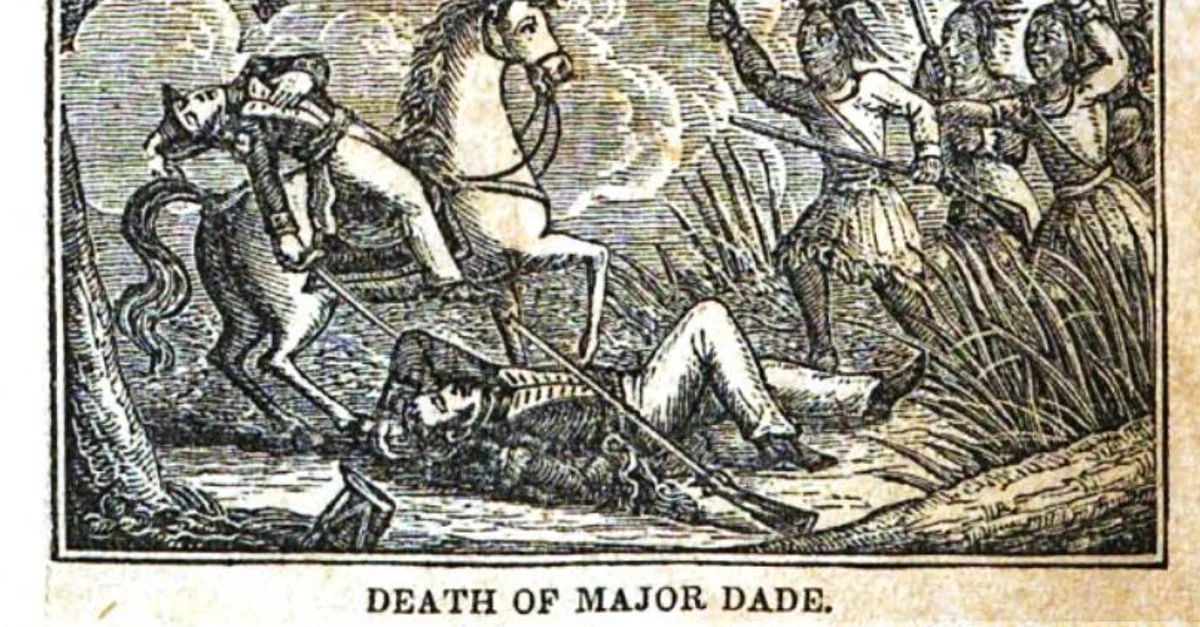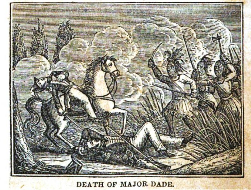Major Francis Dade's death on 28 December 1835 during the Dade Massacre (also known as the Dade Battle), illustration from A History of the United States by Jesse Olney, 1836.