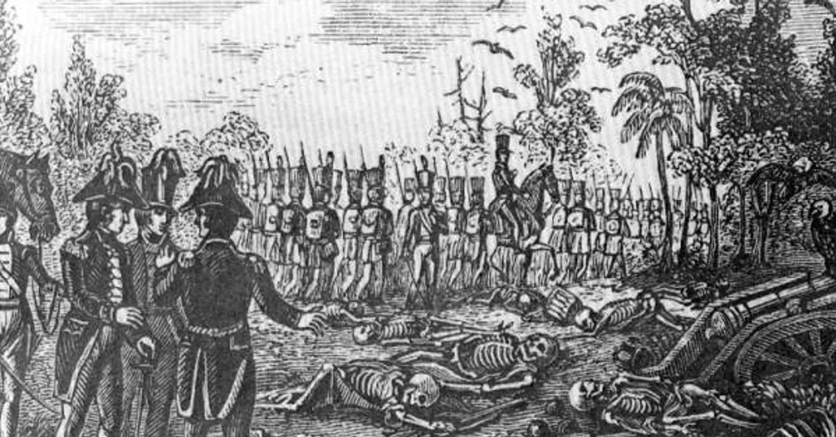 An 1870 illustration of US Army soldiers viewing remains at the Dade Massacre site of 1835, a battle won by the Seminoles of Florida and their allies.