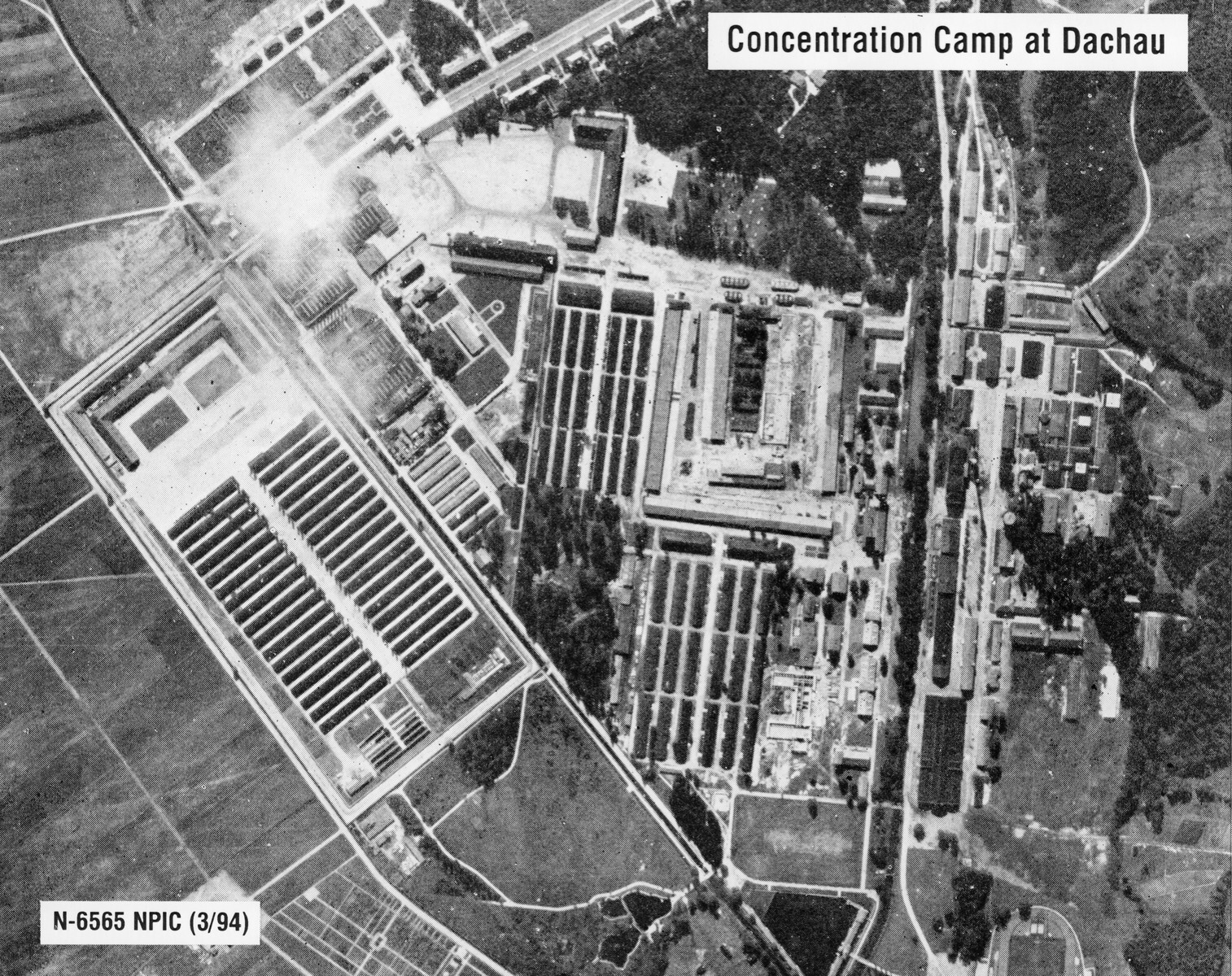 A Second World War (1939-45) photograph of the Nazi concentration camp at Dachau in Germany, taken during an American reconnaissance flight.