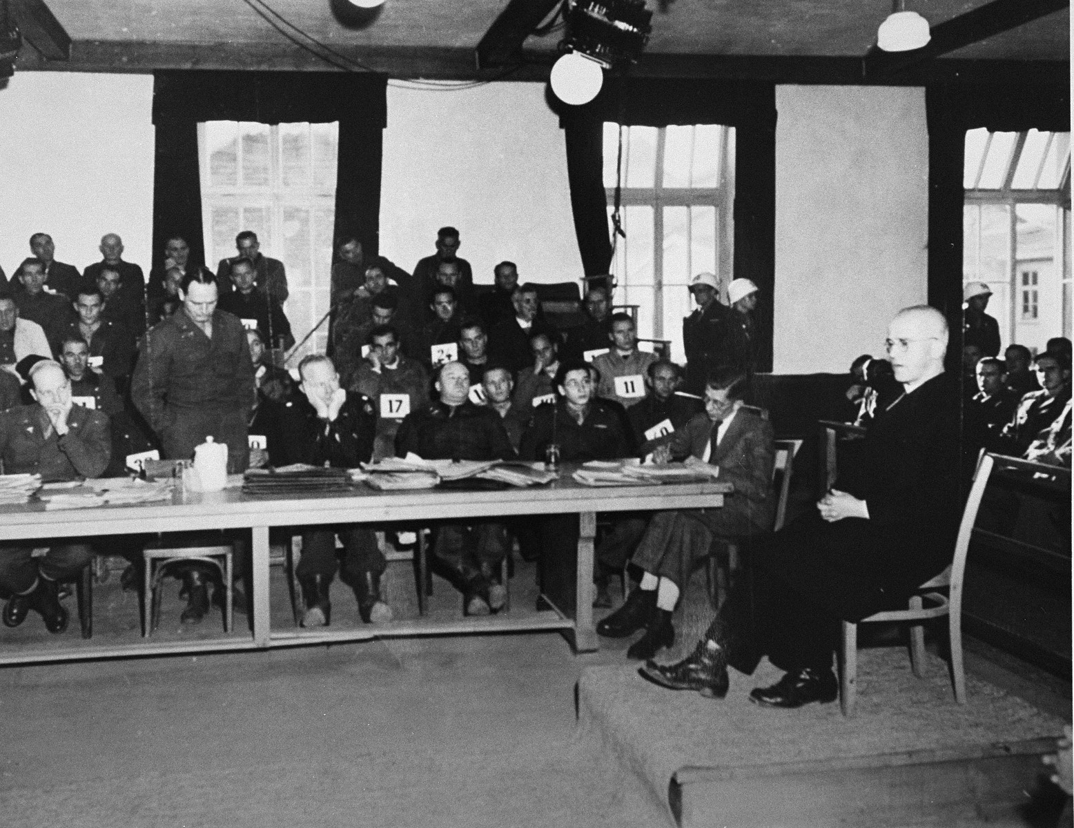 Father Johann Maria Lenz, a surviving inmate of the Nazi-run Dachau concentration camp in Germany testifies at the trial of those individuals who operated the camp and civilians who assisted them in their purpose. The Dachau concentration camp trial took place at the site of the camp from 15 November 1945 until 13 December 1945. (National Archives and Records Administration, College Park)