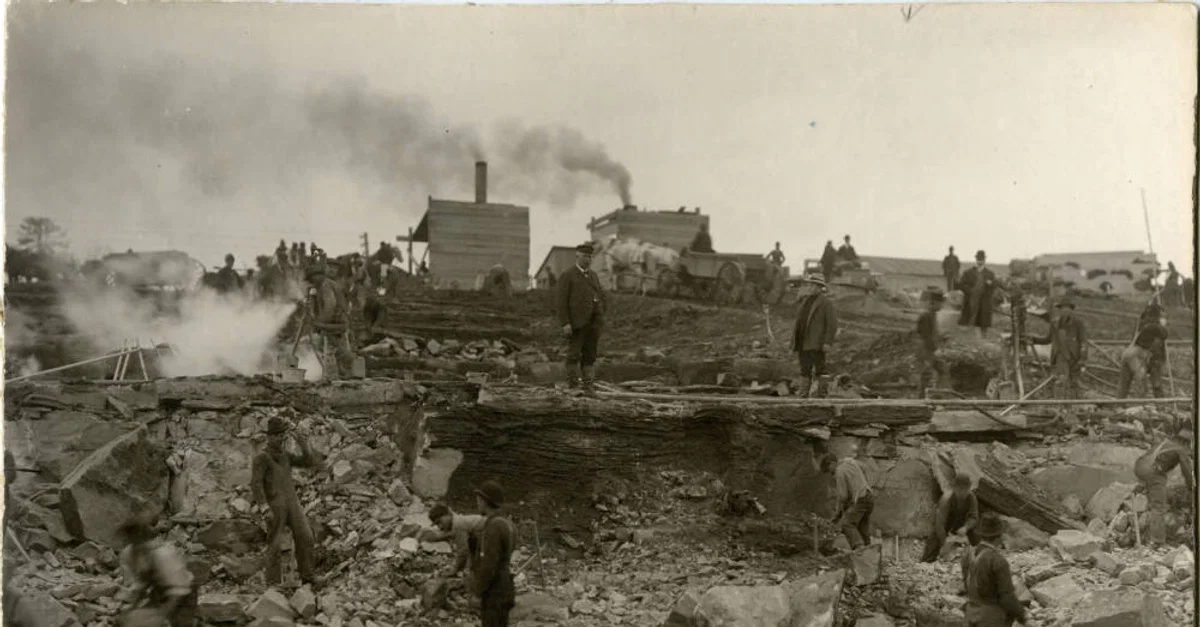 Men work on the construction of the Erie Canal in Scotia, New York.