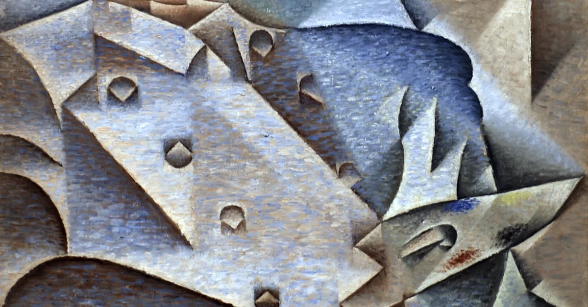 A 1912 oil-on-canvas portrait by Juan Gris (1887-1927) of the painter Pablo Picasso. Gris here uses a Cubist approach to show Picasso from multiple perspectives, breaking up the standard portrait and reassembling the pieces to create an abstract representation of the subject. Gris has represented Picasso with various gemoetrical forms but these forms are all organised along diagonal lines.