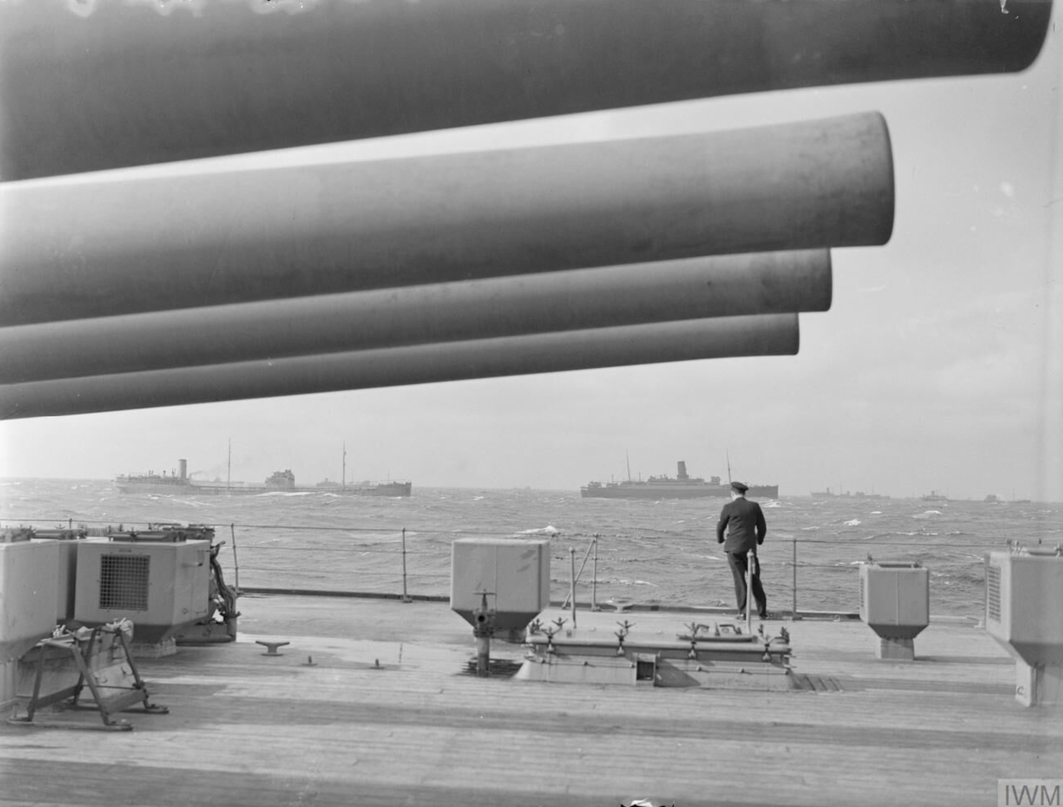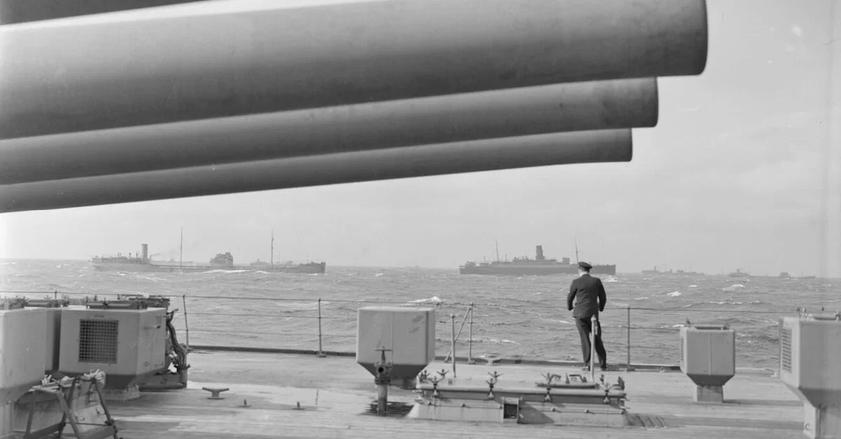 A 1941 photograph taken from the battleship HMS King George V and showing ships of a North Atlantic convoy during the Second World War (1939-45). Convoys were essential to get vital supplies and weaponry from North America to Britain during the war but they were frequent targets of German U-boat submarines. (Imperial War Museums)