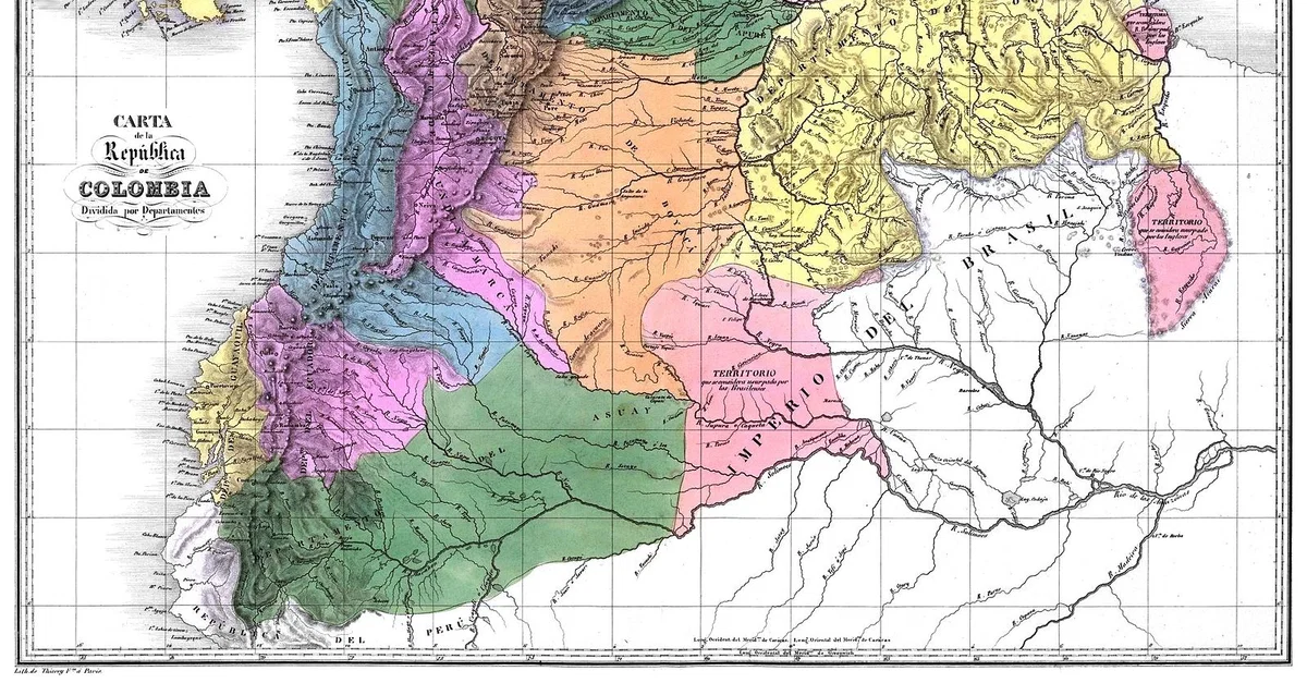 A map of the Republic of Colombia (1819-1831), a state that covered much of northern South America after independence from the Spanish Empire, by Agostino Codazzi, 1840. The map depicts the Republic of Colombia divided into 12 administrative departments in 1824.