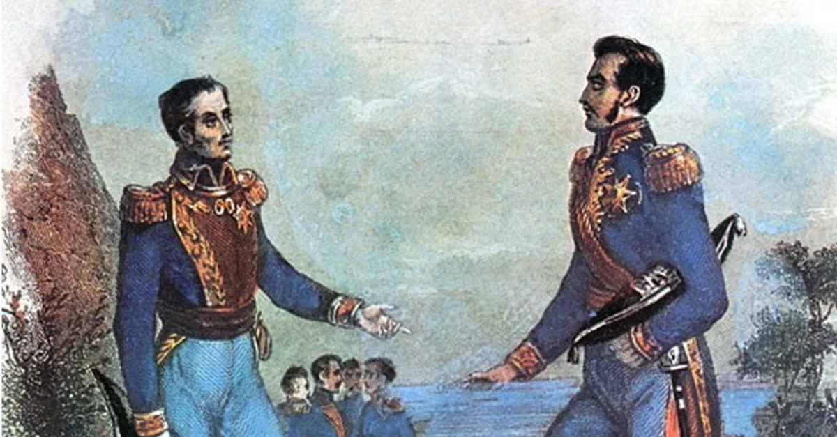 The Guayaquil Conference, an 1822 meeting between libertadors José de San Martín and Simón Bolívar in Guayaquil, Ecuador to discuss the future of an independent Peru and an independent South America, painted by J. Collignon, 1843.