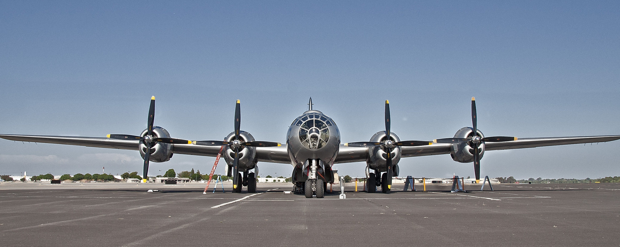Front view of a Boeing B-29 Superfortress. The B-29 long-distance bomber was in active service with the United States Air Force from April 1944. This B-29, called 'Fifi', is one of only two B-29s still capable of flying.
