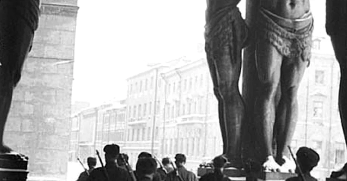A photograph showing Soviet Red Army troops on skis at the entrance of the Hermitage Museum. Taken during the Siege of Leningrad (Saint Petersburg) from September 1941 to January 1944 during the Second World War (1939-45)