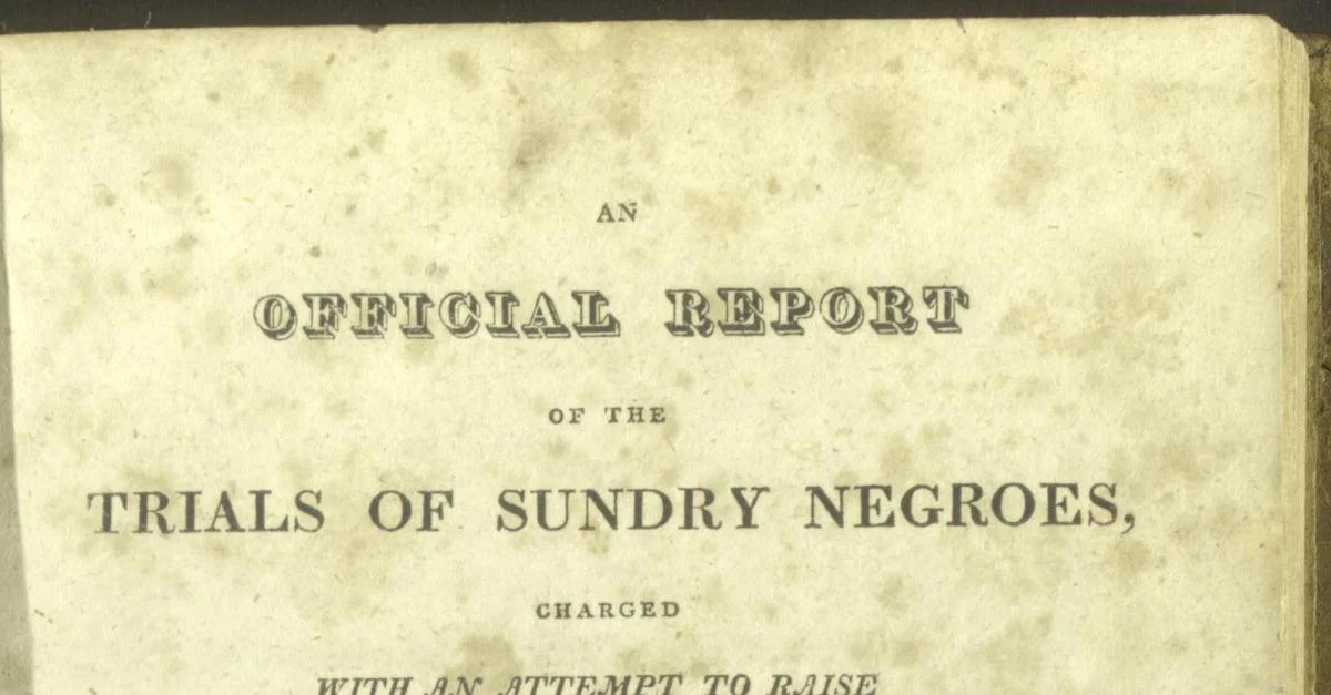 An official report of the trials of sundry Negroes, charged with an attempt to raise an insurrection in the state of South-Carolina preceded by an introduction and narrative: and, in an appendix, a report of the trials of four white persons on indictments for attempting to excite the slaves to insurrection, record of the trial of Denmark Vesey, principal defendant, and others, by Lionel H. Kennedy and Thomas Parker, printed by James R. Schenck, Charleston, 1822.