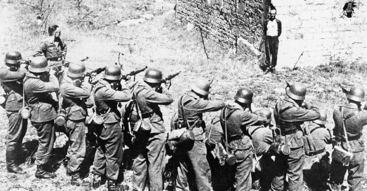 A French Resistance fighter, smiling in defiance, faces a German firing squad during the occupation of France in the Second World War (1939-45).