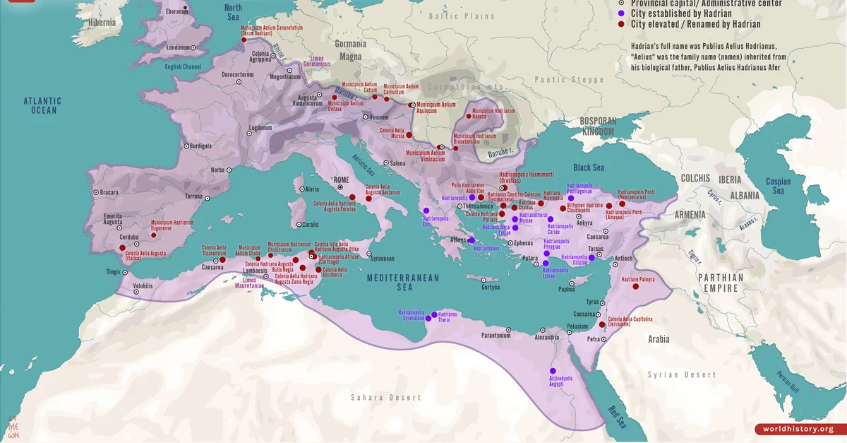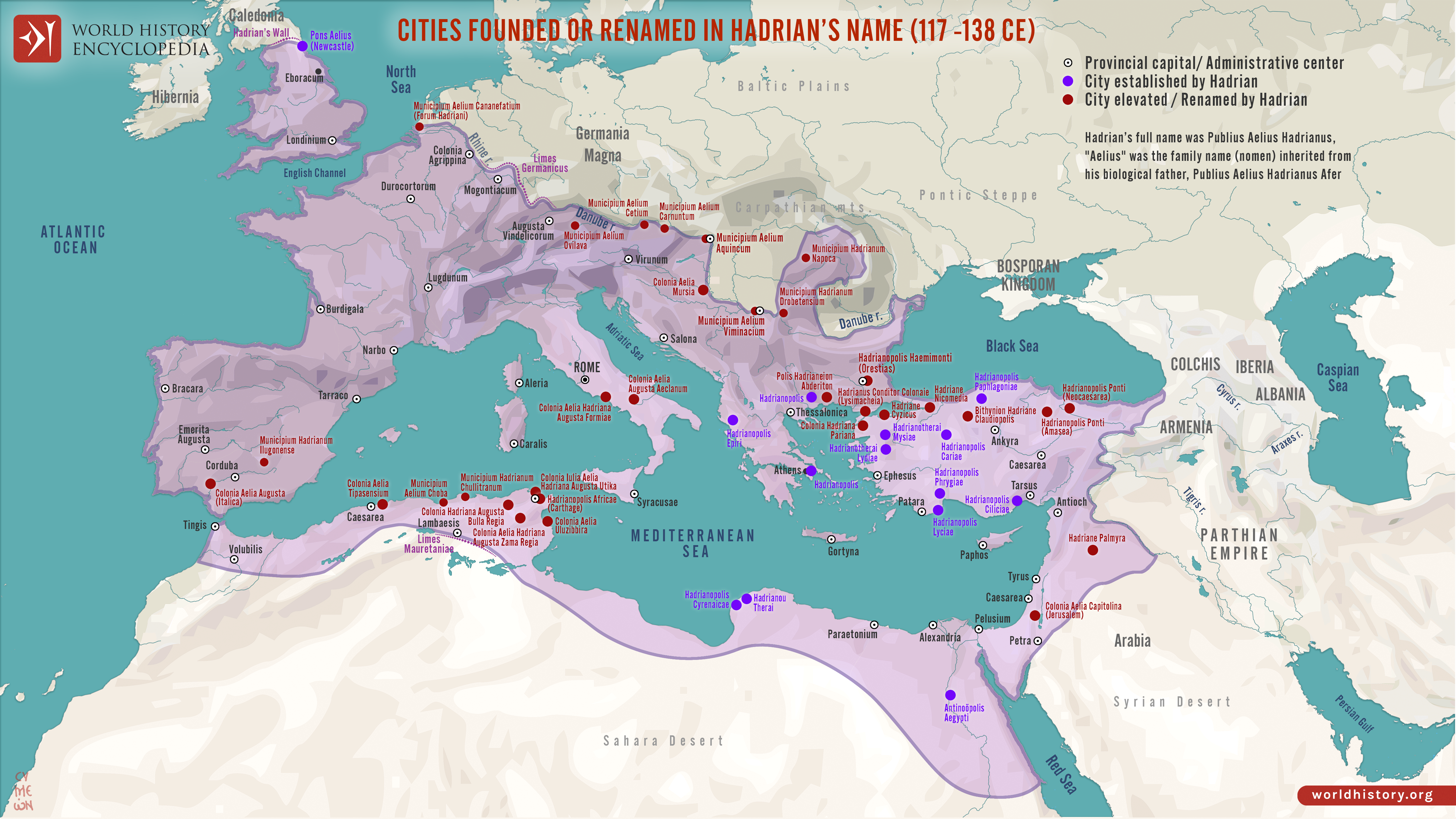 Netchev, S. (2025, March 11). Cities Founded or Renamed in Hadrian’s Name (117 -138 CE). World History Encyclopedia. https://www.worldhistory.org/image/20133/cities-founded-or-renamed-in-hadrians-name-117--13/