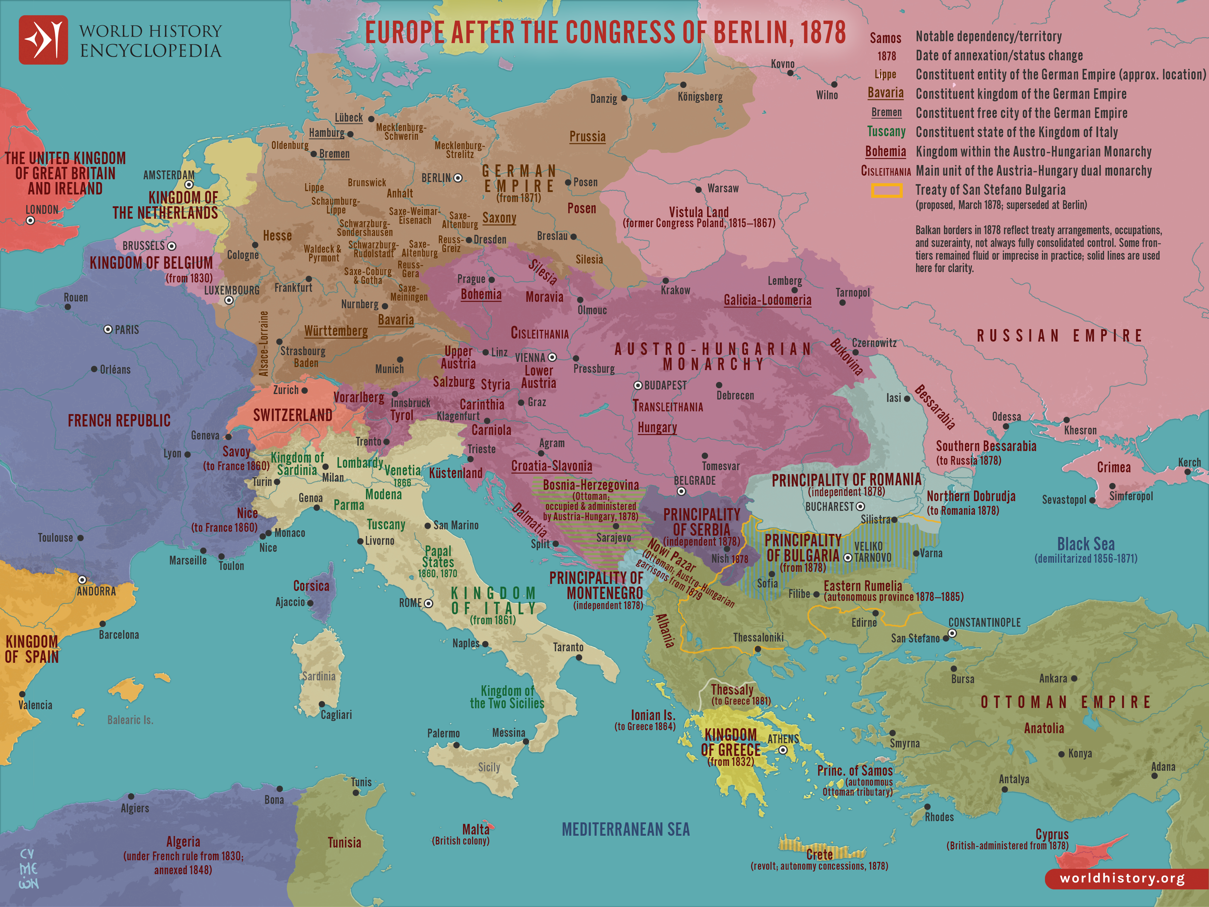 Netchev, Simeon. "Map of Europe after the Congress of Berlin, 1878: From Italian and German Unification to Balkan Crisis." World History Encyclopedia, March 22, 2026. https://www.worldhistory.org/image/20139/map-of-europe-after-the-congress-of-berlin-1878/.
