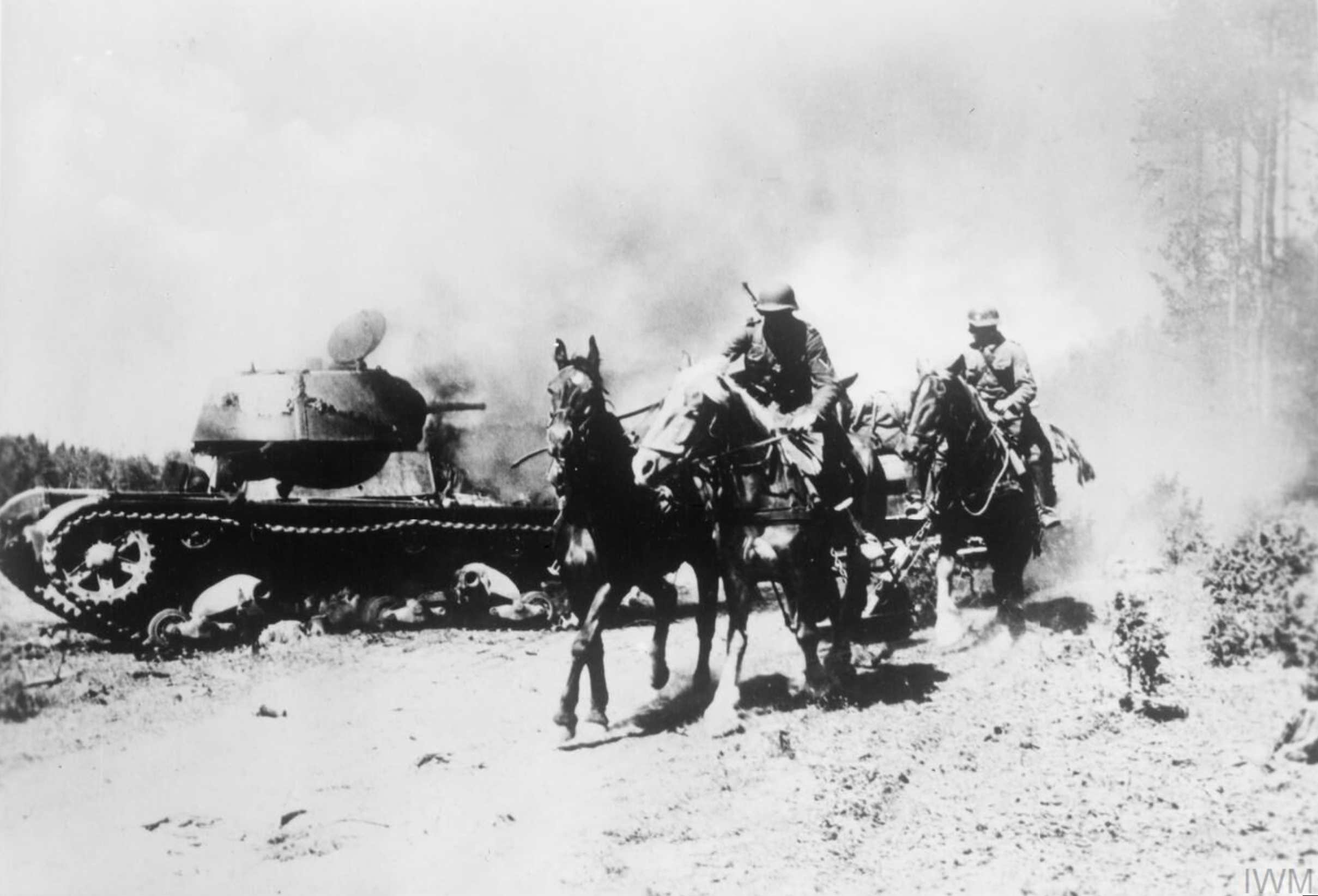 A photograph showing German troops on horseback passing a destroyed Soviet T-26 tank during Operation Barbarossa, the attack by Adolf Hitler (1889-1945) on the USSR from June to December 1941. Horses were used by both sides for want of mechanised transport or in muddy conditions when heavy vehicles got bogged down. (Imperial War Museums)