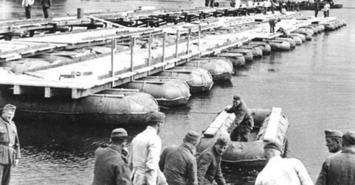 A photograph showing German army engineers building a bridge across the Dnieper near Kiev (Kyiv) during Operation Barbarossa, the attack by Adolf Hitler (1889-1945) on the USSR from June to December 1941. (German Federal Archives)