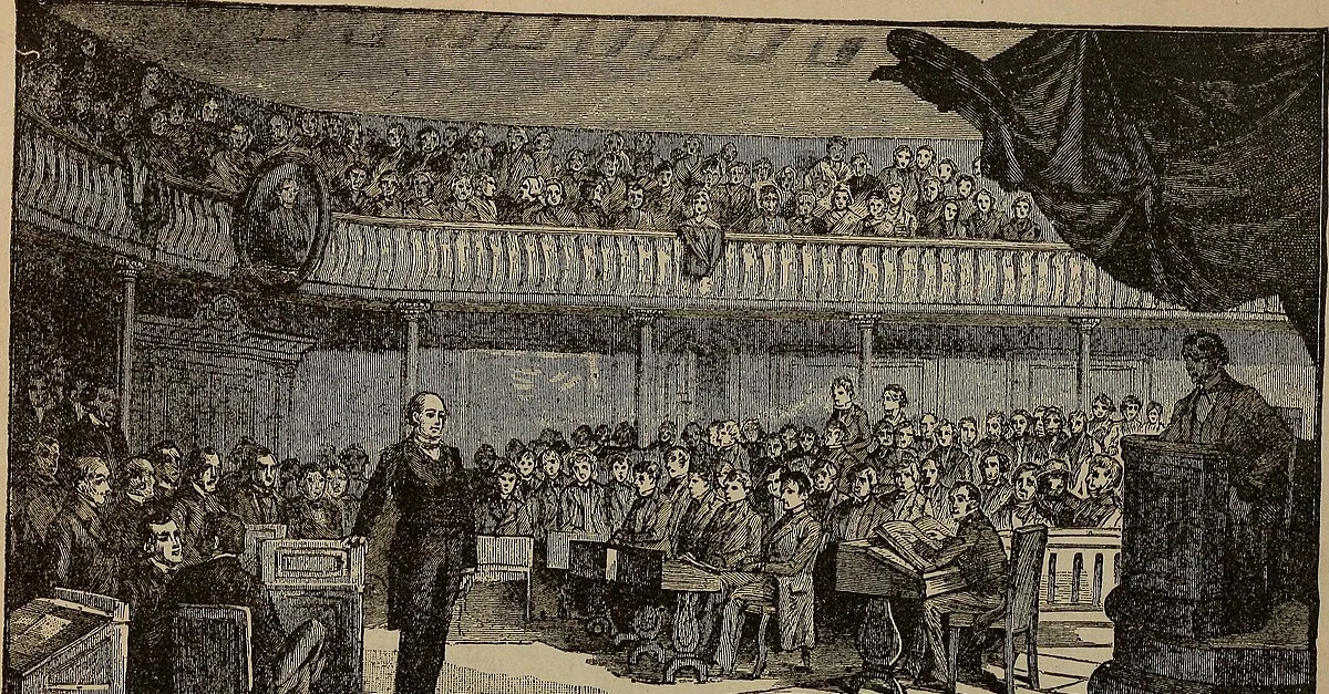 Senator Daniel Webster delivers his famous reply to Senator Robert Y. Hayne on 27 January 1830, at the climax of the Webster-Hayne debate, illustration from 363 of The political history of the United States by James Penny Boyd, 1888.
