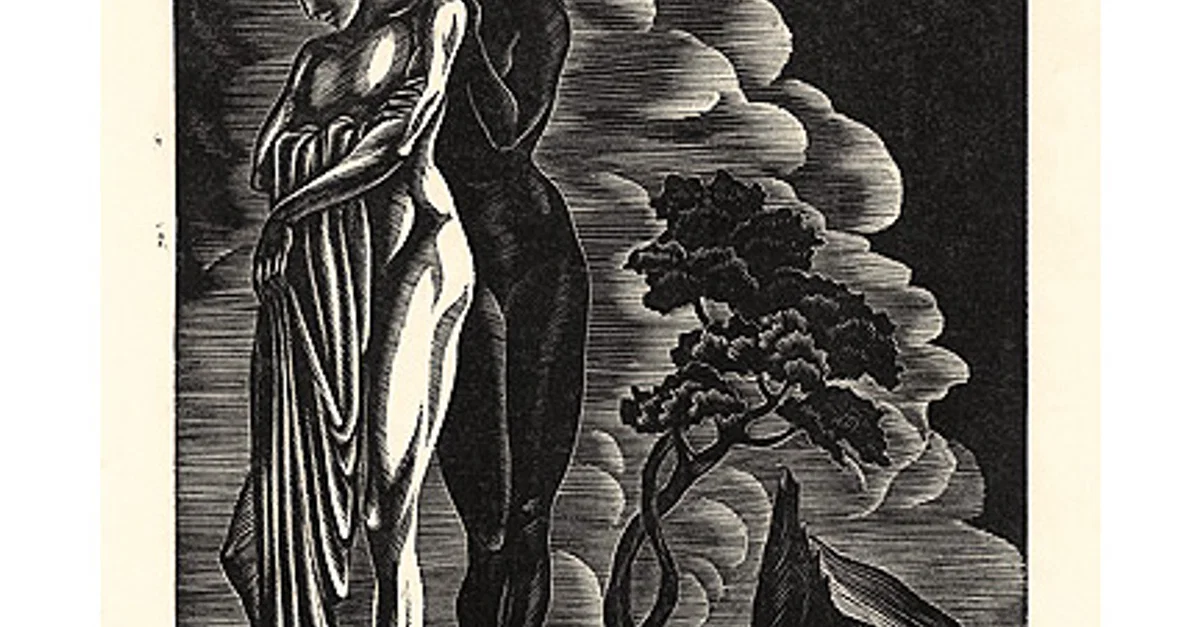 An illustration of the 'two loves' described by William Shakespeare in Sonnet 144 ("Two loves I have for comfort and despair..."), wood engraving by Isac Friedlander, c. 1931.