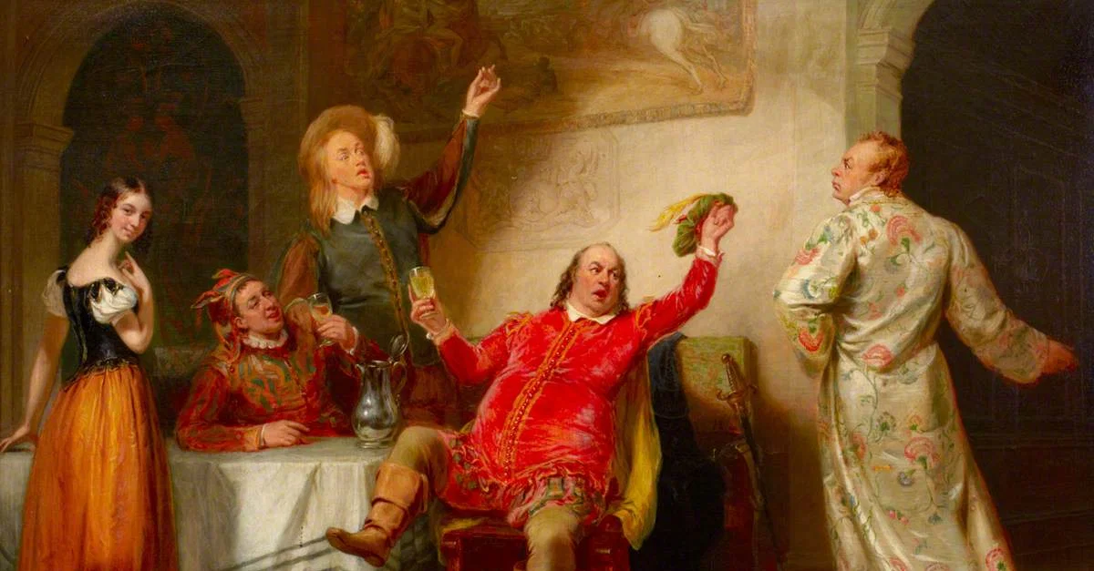 A depiction of Act 2 Scene 3 of William Shakespeare's comedy Twelfth Night in which the puritanical servant Malvolio tries to quiet down Sir Toby Belch and his fellow revelers. It is in this scene that Sir Toby delivers the famous line: "Dost thou think, because thou art virtuous, there shall be nore more cakes and ale?" (2.3.114-115). Oil on canvas painting by George Clint, 1833.