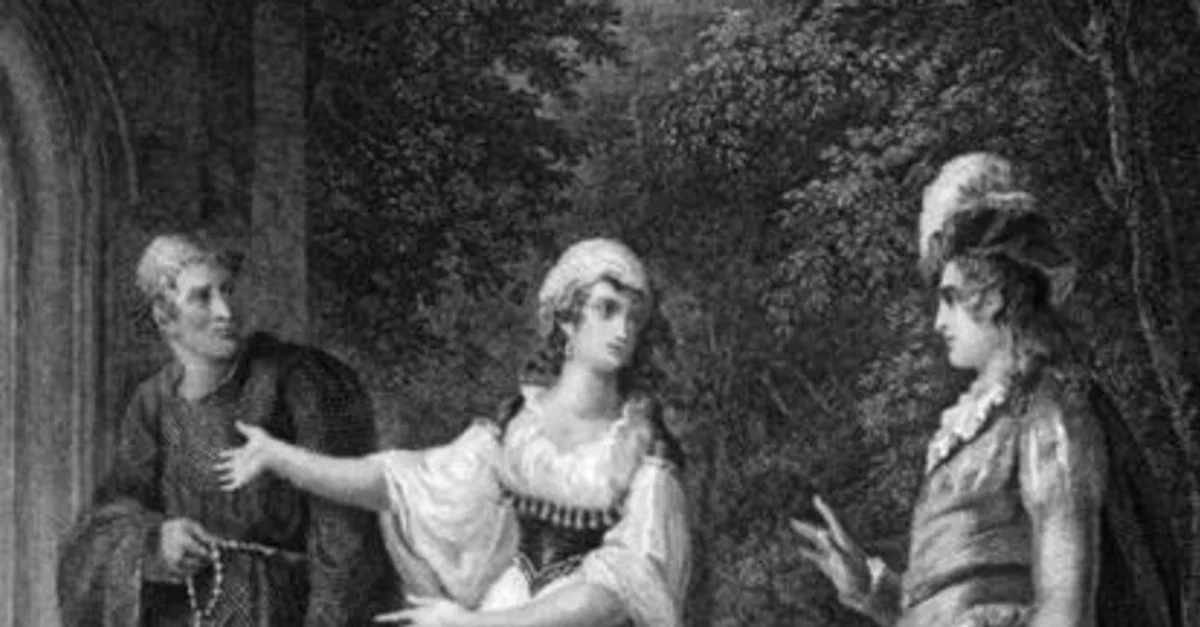 Sebastian and Olivia agree to marry one another in Act IV of William Shakespeare's comedy Twelfth Night. Painting by W. Hamilton, engraving by W. Angus, 18th century.