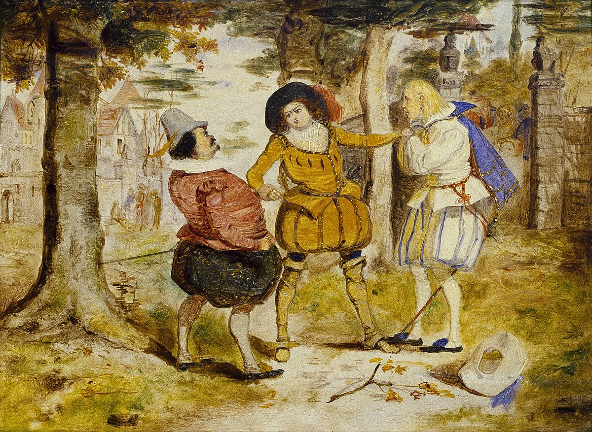 In Act IV Scene I of William Shakespeare's comedy Twelfth Night, Sir Toby Belch rushes to the assistance of Sir Andrew Aguecheek, who is being beaten bloody by Sebastian. Oil on panel by Arthur Boyd Houghton, c. 1854.