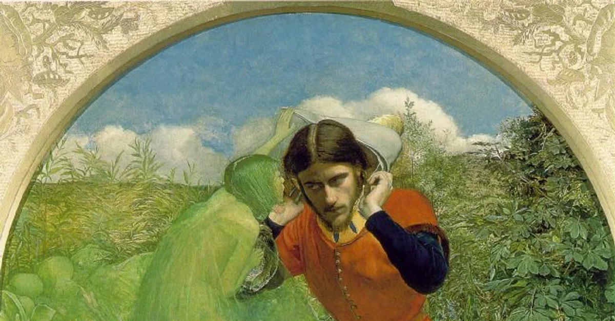 Ariel lures Prince Ferdinand to Prospero's cell in Act I Scene II of William Shakespeare's play The Tempest (1611). Oil on canvas by John Everett Millais, 1850.