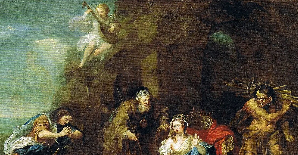 Prince Ferdinand courts Miranda in Act I Scene II of William Shakespeare's play The Tempest; Prospero stands over the shoulder of Miranda, while Caliban carries wood, and Ariel hovers above the scene. Oil on canvas by William Hogarth, c. 1736.