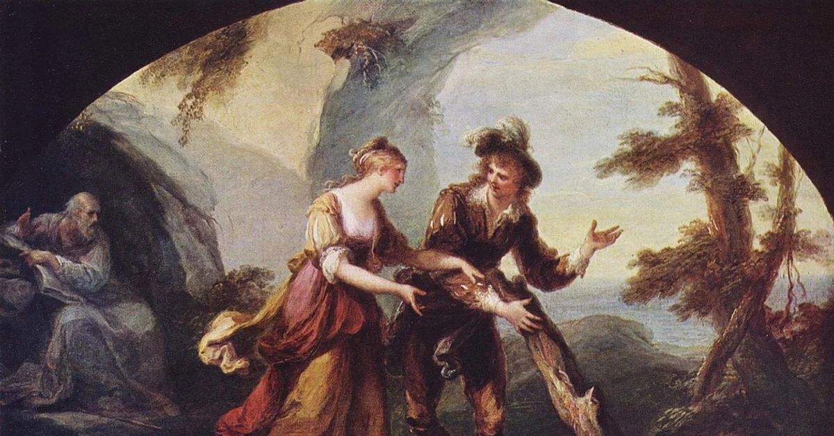 The two lovers, Miranda and Ferdinand, gather wood in Act III Scene I of William Shakespeare's The Tempest, as Prospero watches in the background. Oil on canvas by Angelica Kauffmann, 1782.