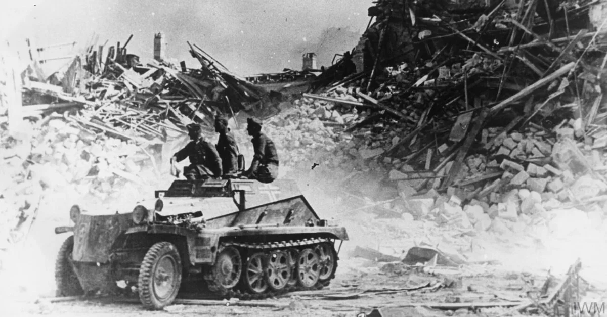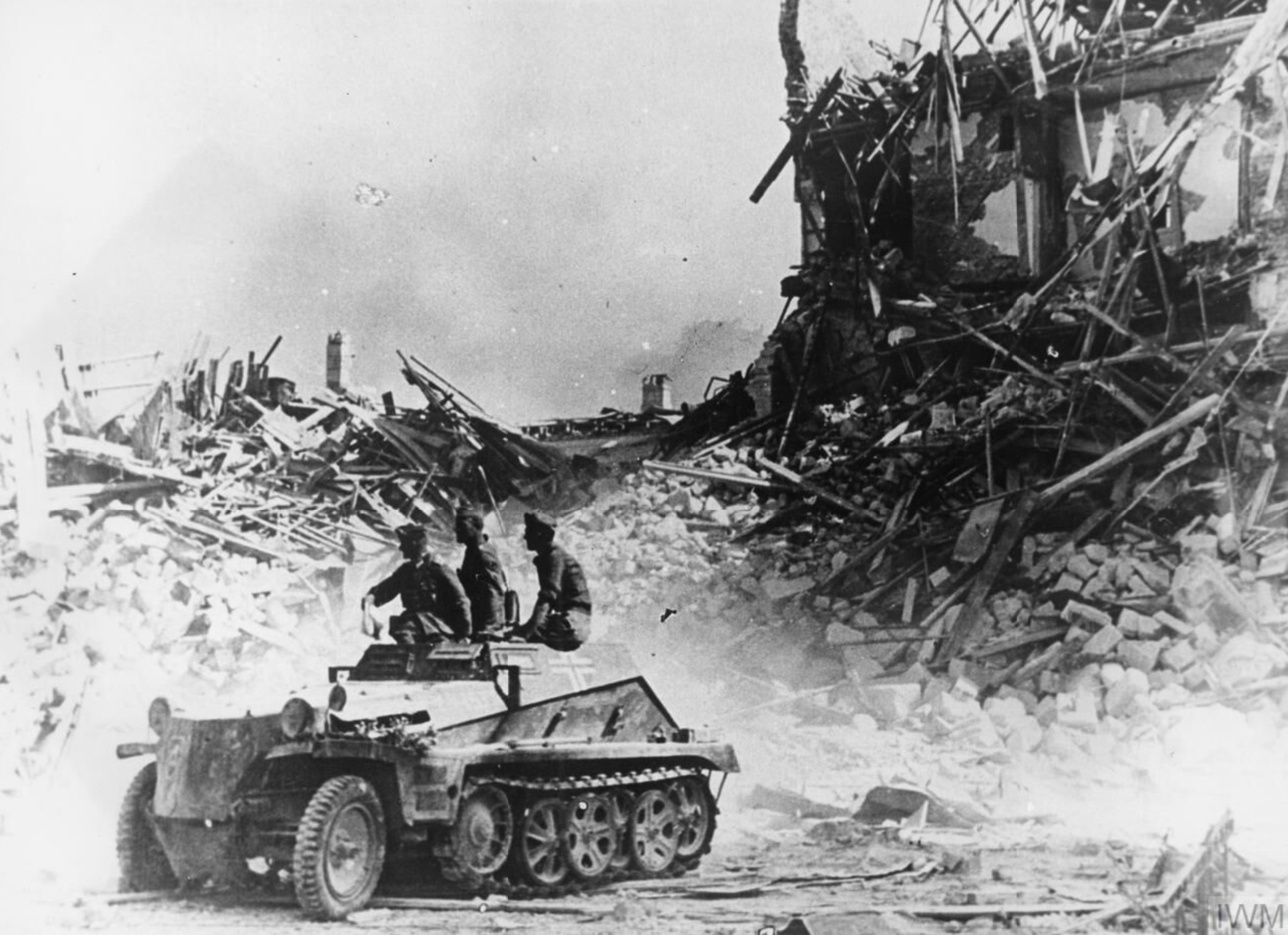 A photograph taken in July 1942 showing the aftermath of the Siege of Sevastopol in 1941-2 during the Second World War (1939-45). The port in the Crimea was captured by Axis forces in July 1942. The vehicle is a German Sdkfz 250 half-track. (Imperial War Museums)