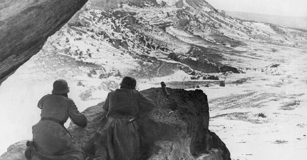 A December 1941 photograph showing two German soldiers overlooking Sevastopol during the Siege of Sevastopol in 1941-2 in the Second World War (1939-45). (Polish National Digital Archives)