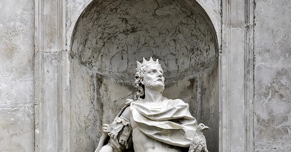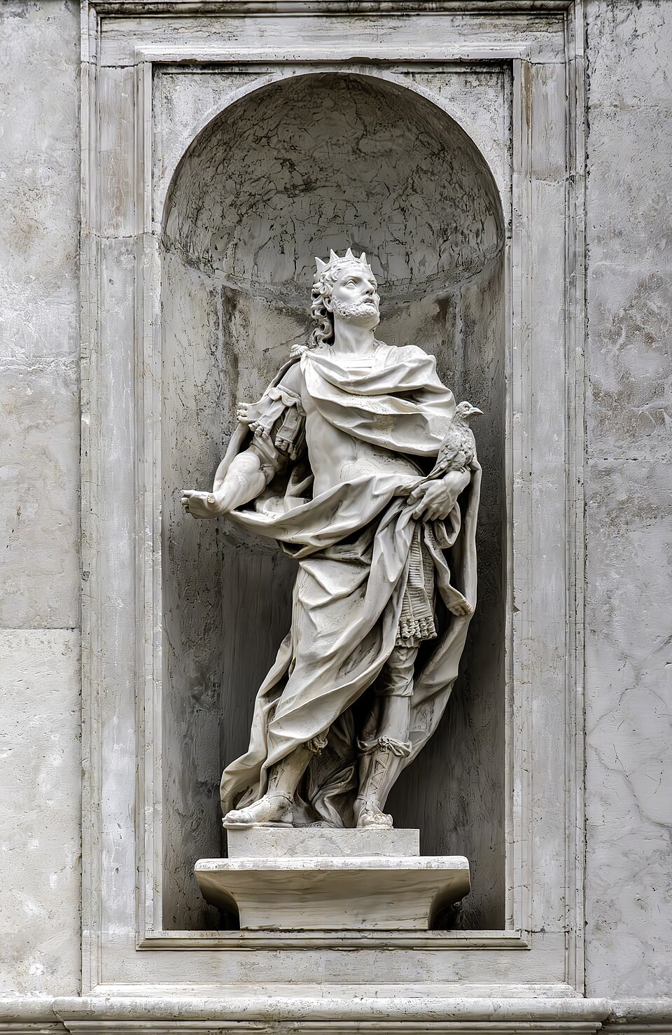 A Statue of Saint Oswald, King of Northumbria (r. 634-642) on the front of the Church of San Stae, in Venice, Italy, by Italian artist Giuseppe Torretto (1661-1743).