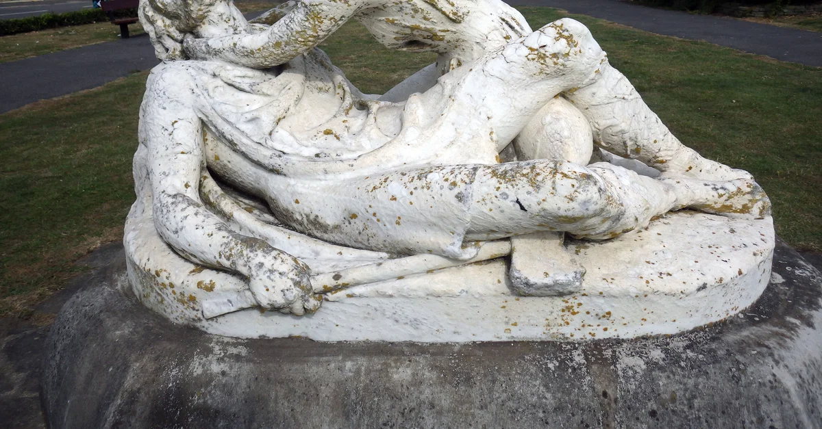 The statue shows Edith Swanneck finding the body of the English king Harold Godwinson (r. Jan-Oct 1066) on the field of the Battle of Hastings in 1066. It was built by Charles Augustus William Wilke, 1875, a few miles from the battlefield of Hasting, in Sussex, southeast England.