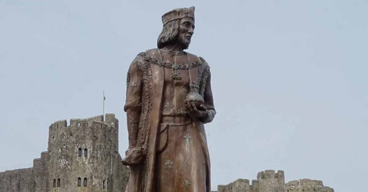 A statue of Henry VII, King of England (r. 1485-1509), built by Harriet Addyman, 2017. The statue sits outside Pembroke Castle, south Wales, where Henry was born in 1457.