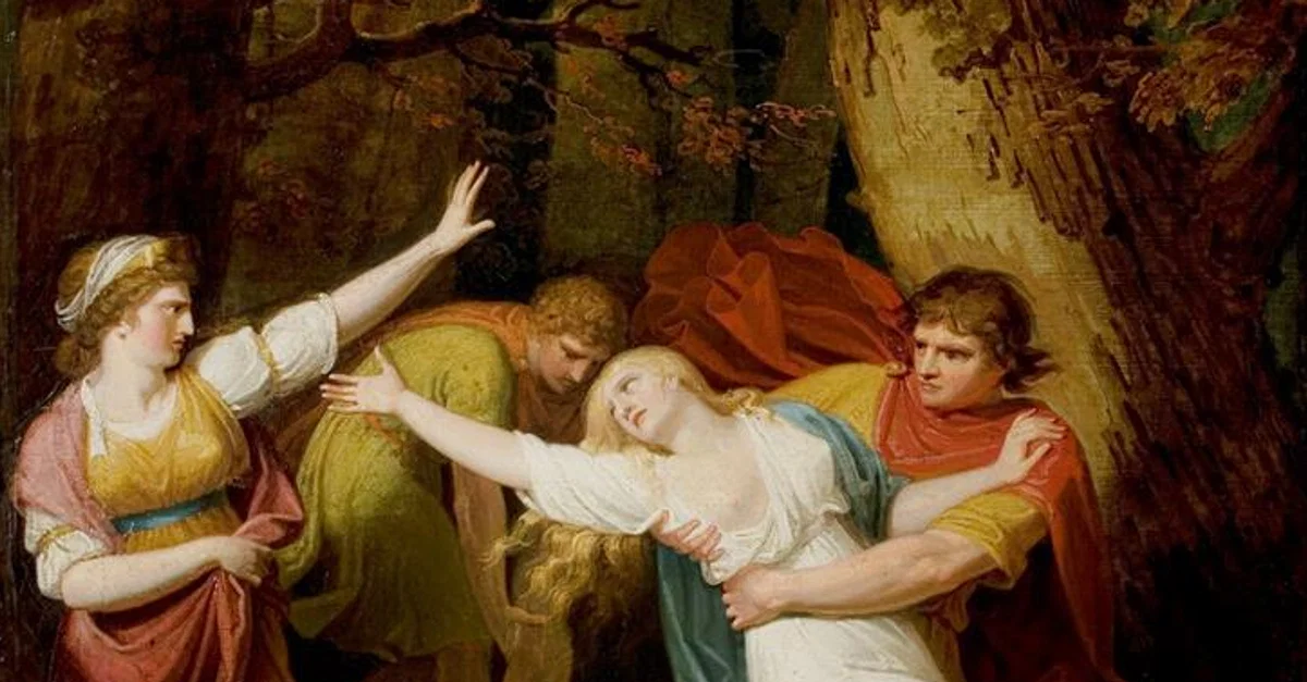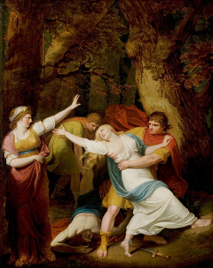 Tamora, Lavinia, Demetrius, and Chiron in Act II Scene 3 of William Shakespeare's Titus Andronicus, painting by Samuel Woodforde (1763-1817).