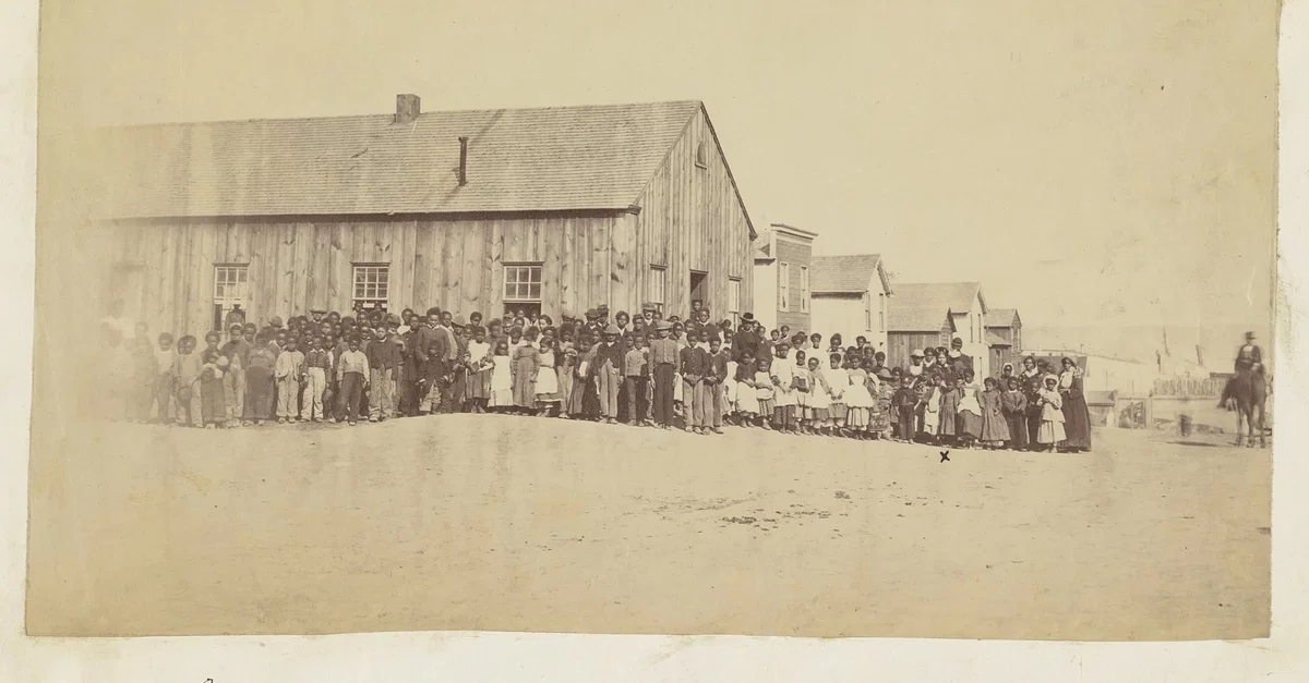 The Jacobs Free School, which offered tuition-free schooling to African-American children. Founded by Harriet Jacobs, the school was unique in being free to use and run by African-Americans (the head of the school was Harriet's daughter, Louisa Matilda Jacobs, assisted by another young African-American woman) instead of being led by White abolitionists. Harriet Jacobs is indicated with a small X beneath her. This photograph was taken in 1864 and distributed to Northern abolitionists who had helped fund the school.