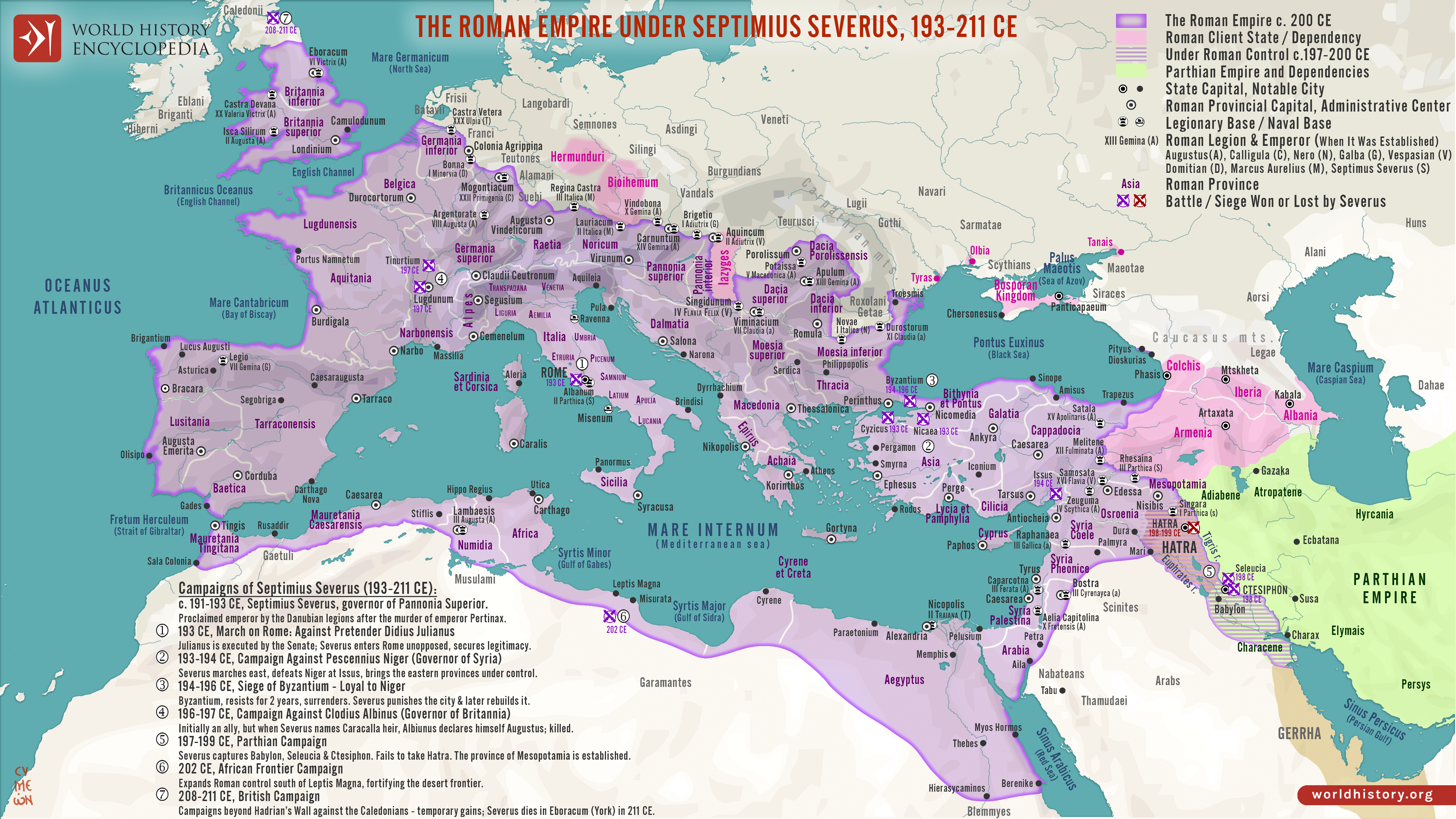 Netchev, S. (2025, April 14). Map of the Roman Empire under Septimius Severus, 193-211 CE: Reshaping an Empire: Power, Ambition, and the Birth of a Military Dynasty. World History Encyclopedia. https://www.worldhistory.org/image/20342/map-of-the-roman-empire-under-septimius-severus-19/