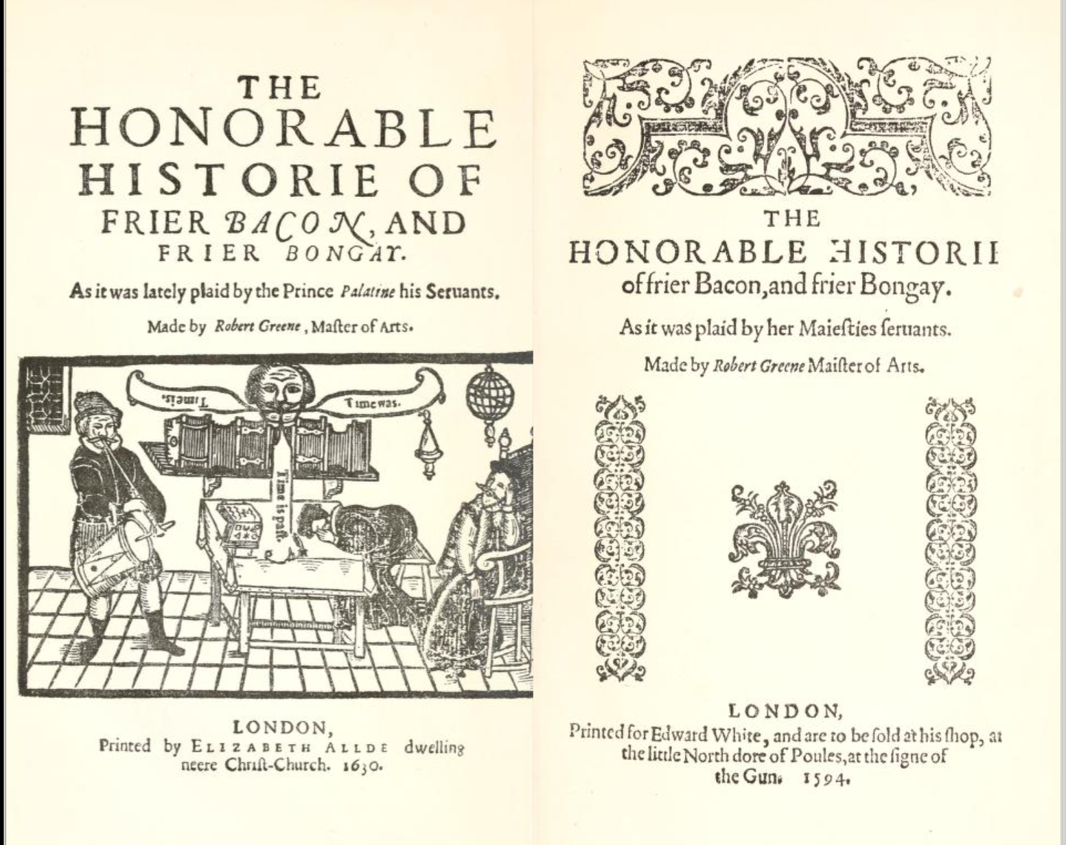 Title pages of two editions of The Honorable Historie of Frier Bacon and Frier Bongay by Robert Greene (c. 1558-1592), reproduced in The Plays & Poems of Robert Greene, 1905.