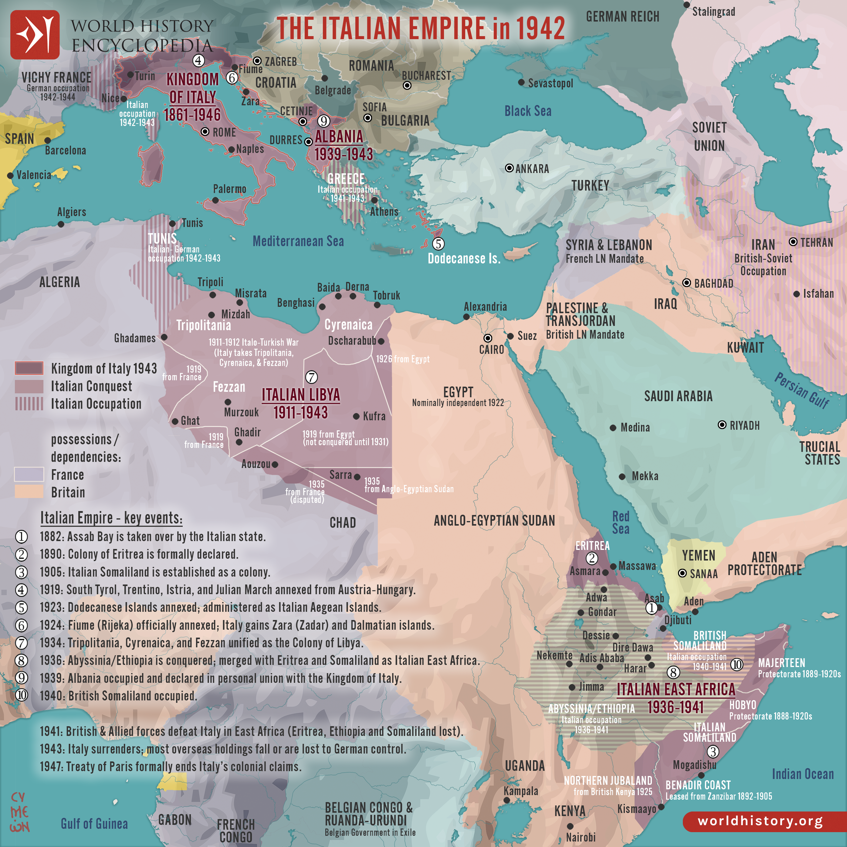 Netchev, S. (2025, April 16). Map of the Italian Empire in 1942: The Spatial and Political Dimensions of Italian Imperialism. World History Encyclopedia. https://www.worldhistory.org/image/20362/map-of-the-italian-empire-in-1942/