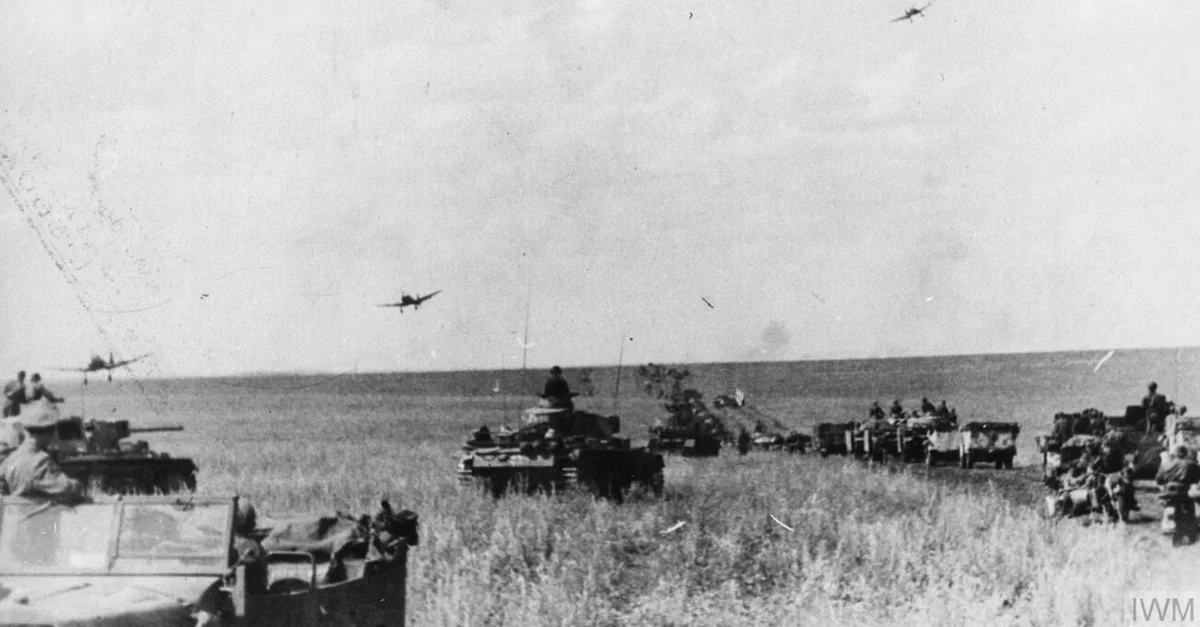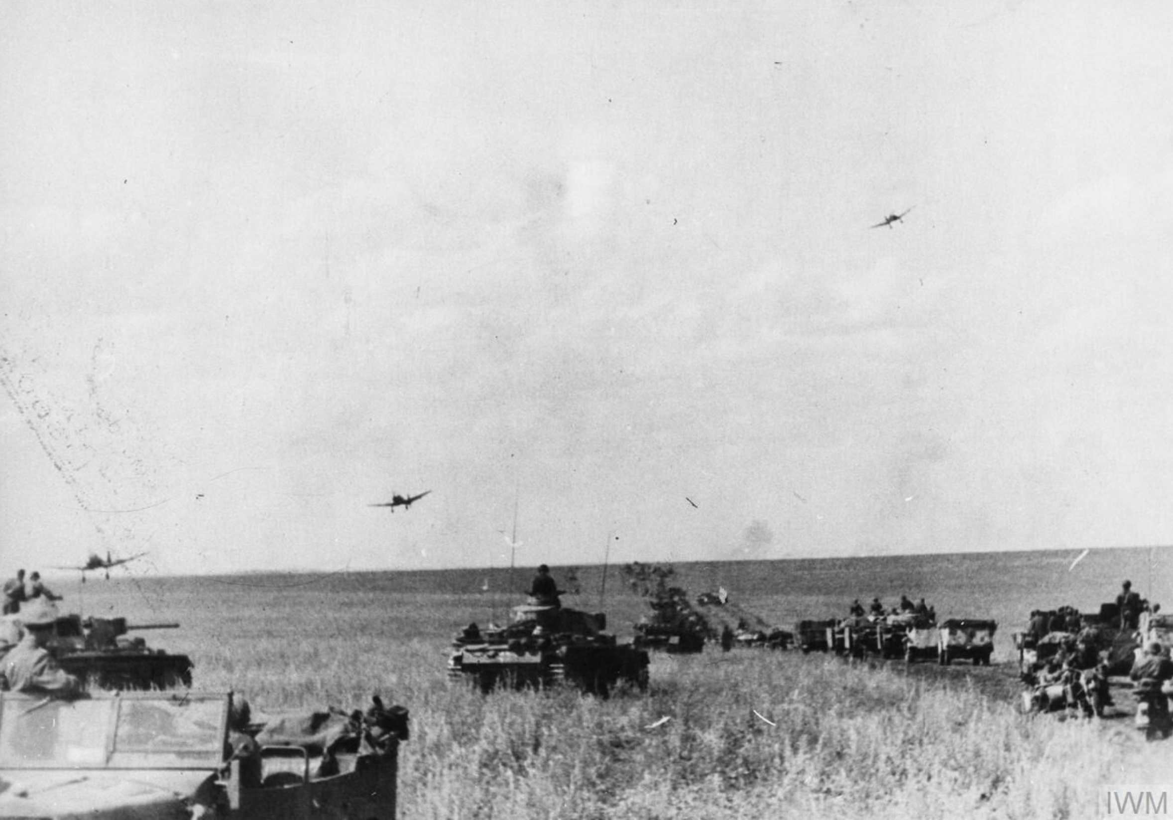 A photograph showing Junkers Ju 87 Stuka dive bombers flying over German Panzer III tanks and other vehicles on the Orel front of the battle of Kursk in July 1943 during the Second World War (1939-45). (Imperial War Museums)