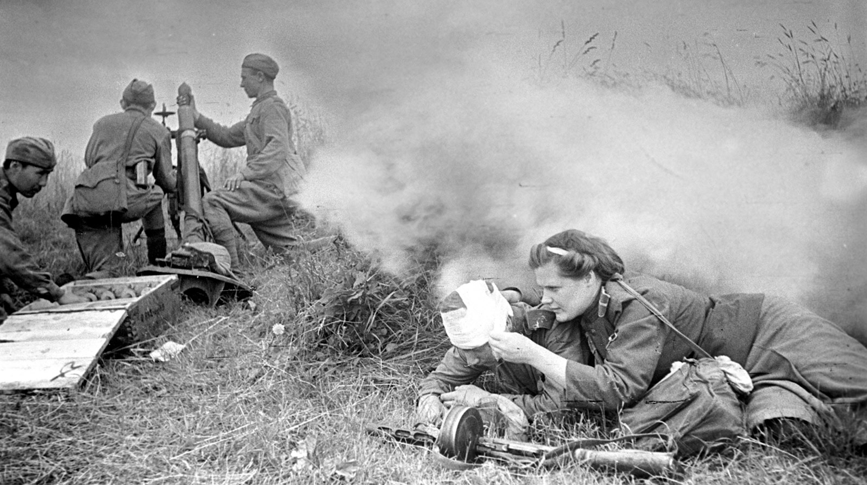 A photograph of a Red Army mortar unit and female medic tending a wounded soldier at the battle of Kursk in the summer of 1943 during the Second World War (1939-45).