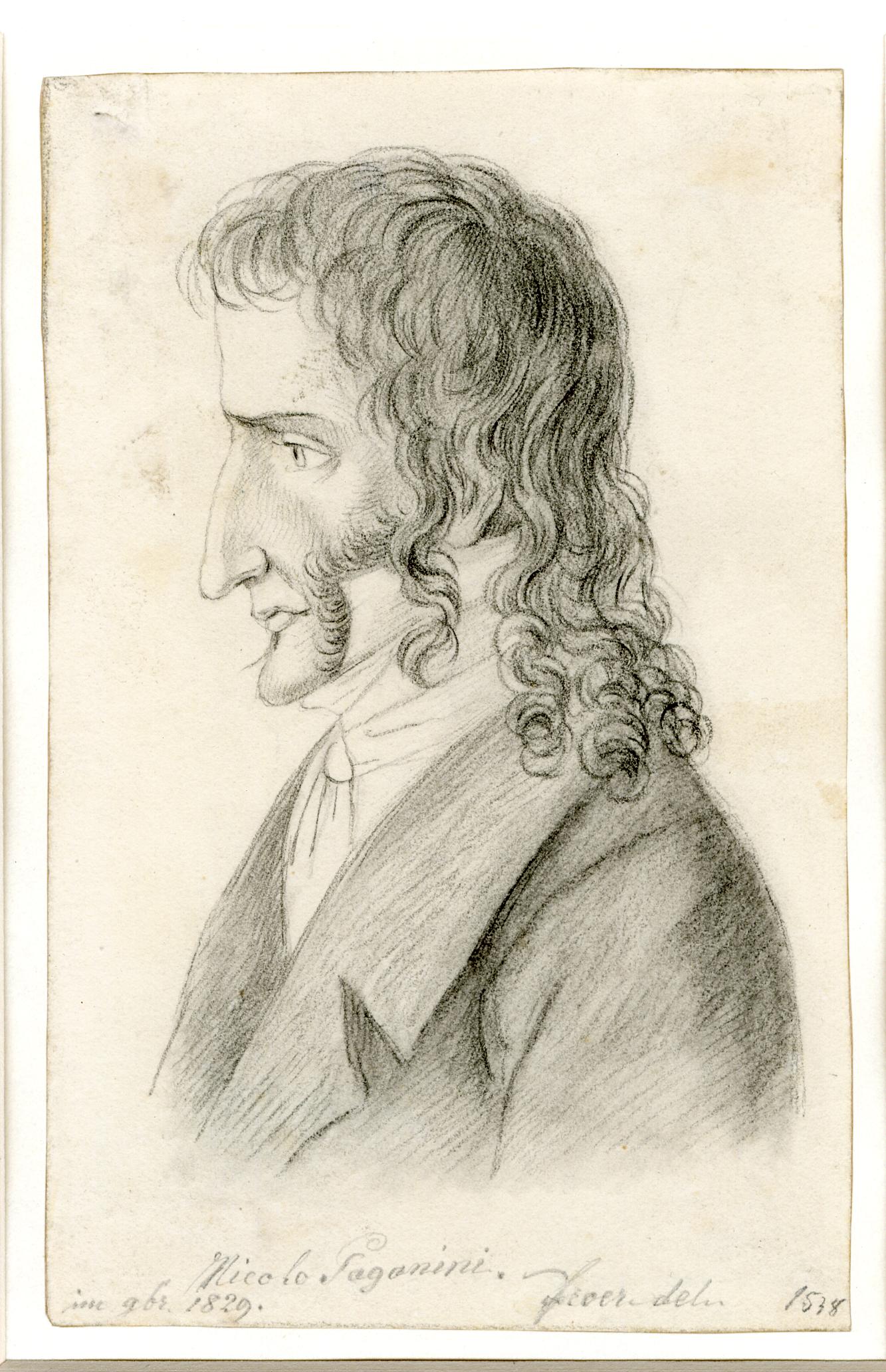 A profile bust-length portrait of Niccolò Paganini (1782-1840), Italian violinist and composer, illustration on paper, by Froer, 1838.