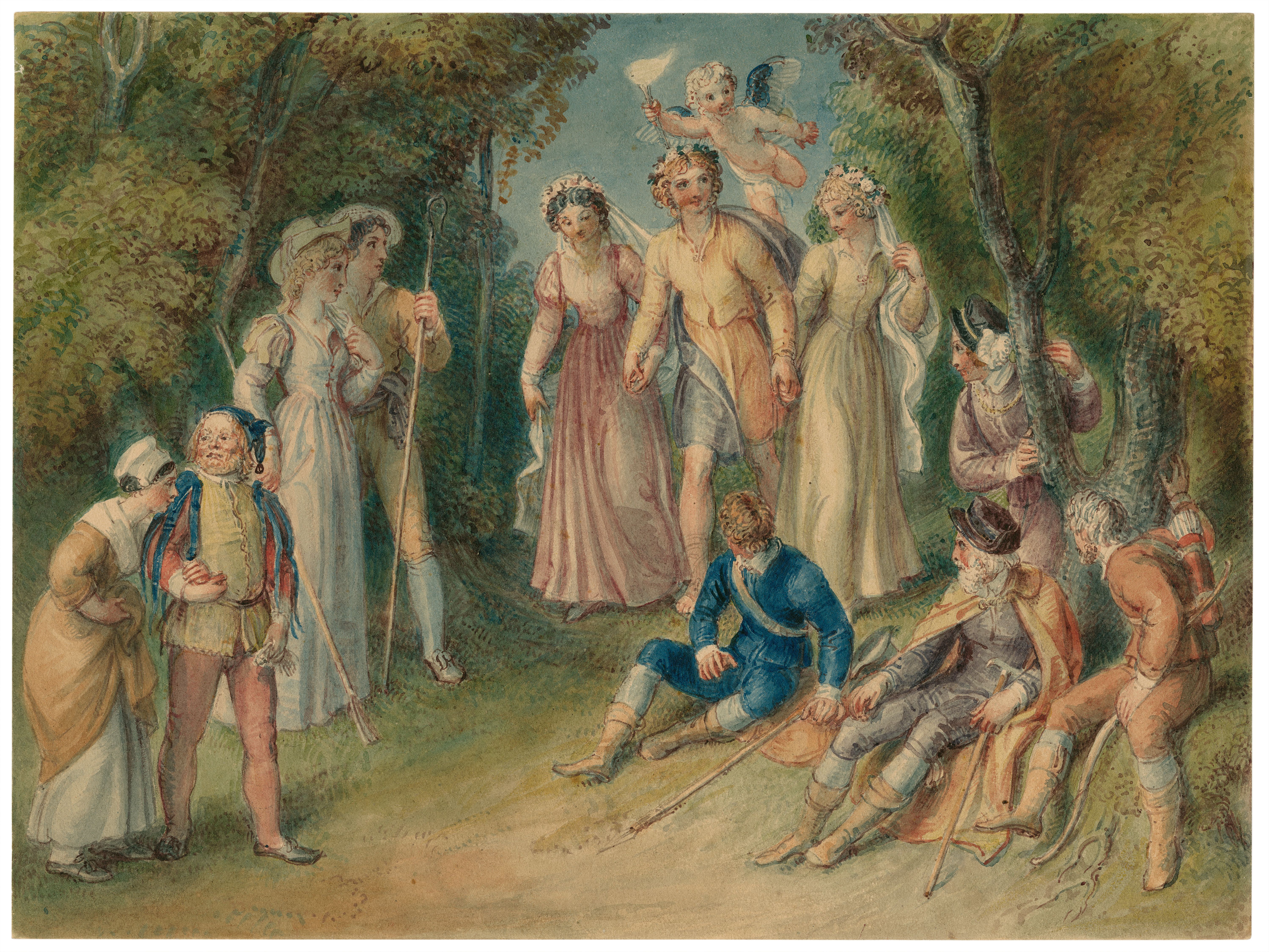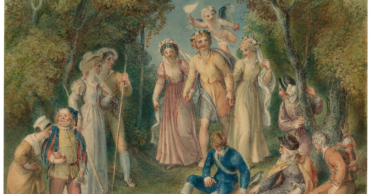 The god Hymen marries the four couples at the end of William Shakespeare's romantic comedy As You Like It (1599), drawing by Thomas Stothard, late 18th or early 19th century.
