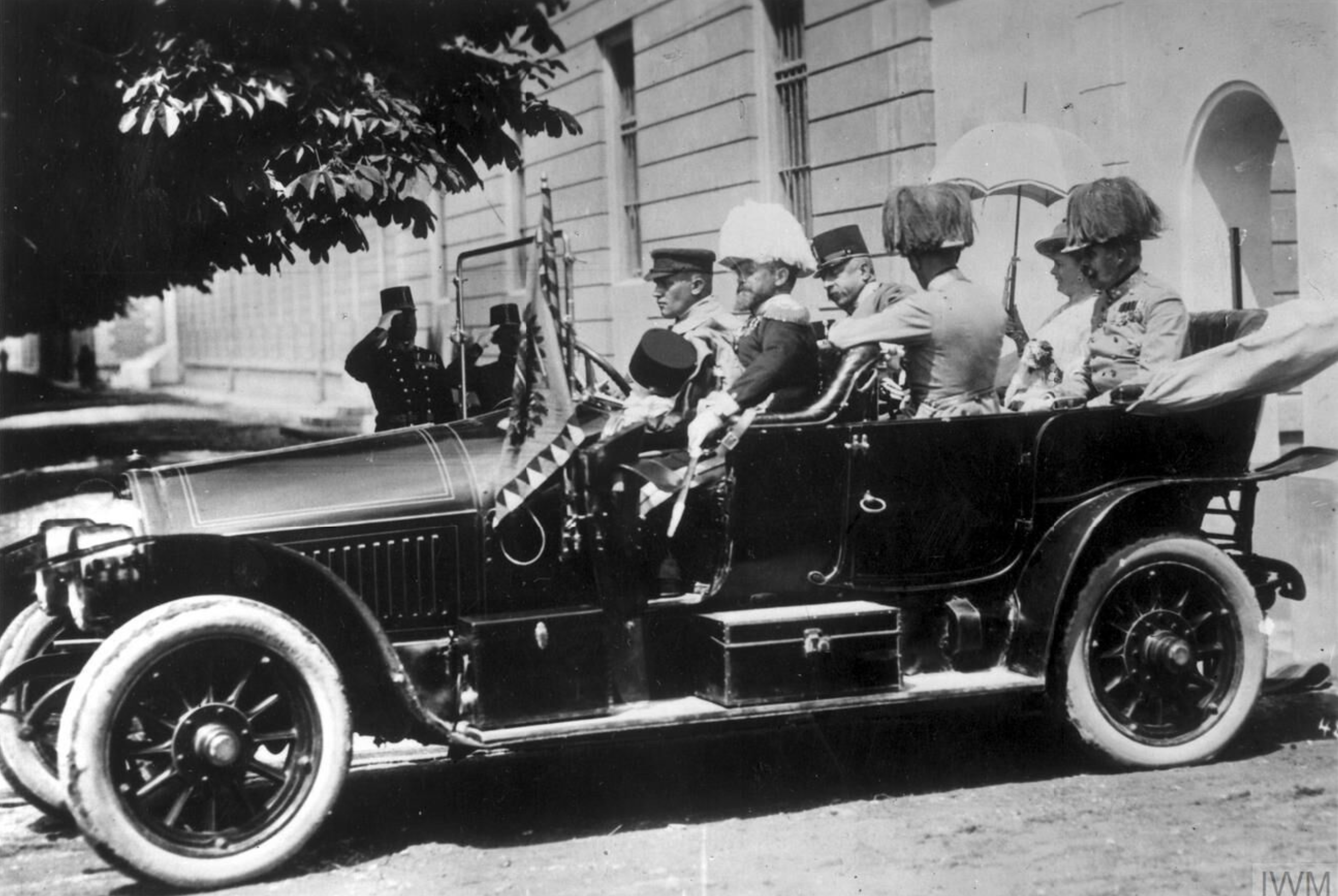 A photograph showing Archduke Franz Ferdinand (1863-1914), heir to the Habsburg throne of the Austro-Hungarian Empire, and his wife Countess Sophie Chotek, both seated in the rear of the car during a tour of Sarajevo. The archduke and countess were shot and killed by a young Slav nationalist, Gavrilo Princip (1894-1918), on 28 June 1914, an incident which sparked off the First World War (1914-18).