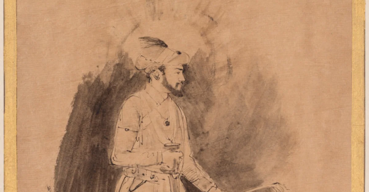 Portrait of Shah Jahan (1592-1666), ruler of the Mughal Empire from 1628-58, drawing in pen and brown ink, with brown wash applied by brush, by Dutch artist Rembrandt van Rijn, c. 1656-61.