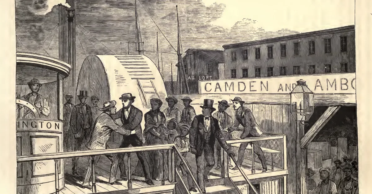 Jane Johnson emancipates herself and her children by walking away from her former 'master', John Hill Wheeler, into the free city of Philadelphia, Pennsylvania, in July 1855. Illustration from The Underground Railroad by William Still, 1872.