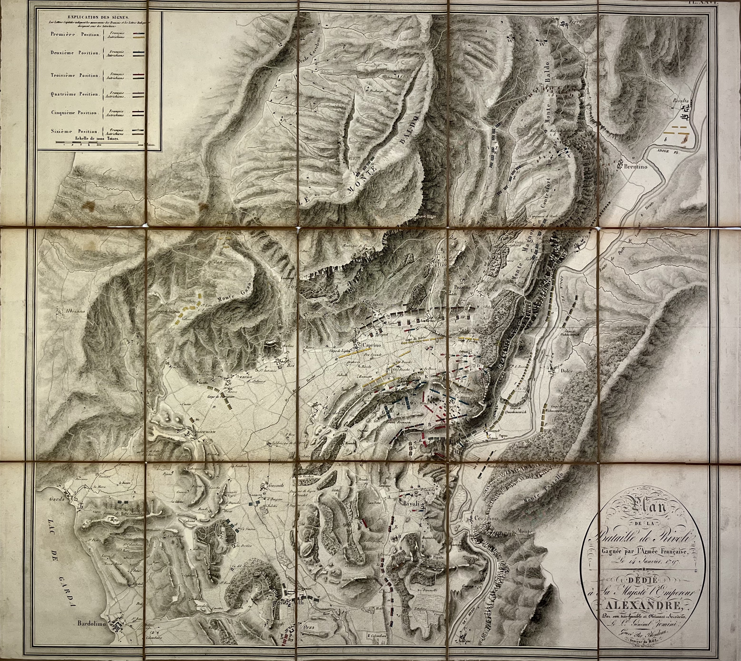 This detailed map of the Battle of Rivoli, won by the French Army on 14 January 1797, was dedicated to His Majesty Emperor Alexander by General Jomini. Engraved by Blondeau and scripted by Sauvé, the map precisely illustrates the positions of French and Austrian forces during the engagement. It serves as a valuable cartographic record of one of the key victories of the Italian campaign. Source: Votre Carte Ancienne – antique maps of Italy.