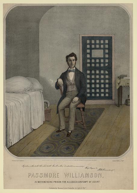 Passmore Williamson, abolitionist, in Moyamensing Prison in 1855, portrait by Emil Luders, lithograph by Augustus Kollner, published by Thomas Curtis, Philadelphia, c. 1855.