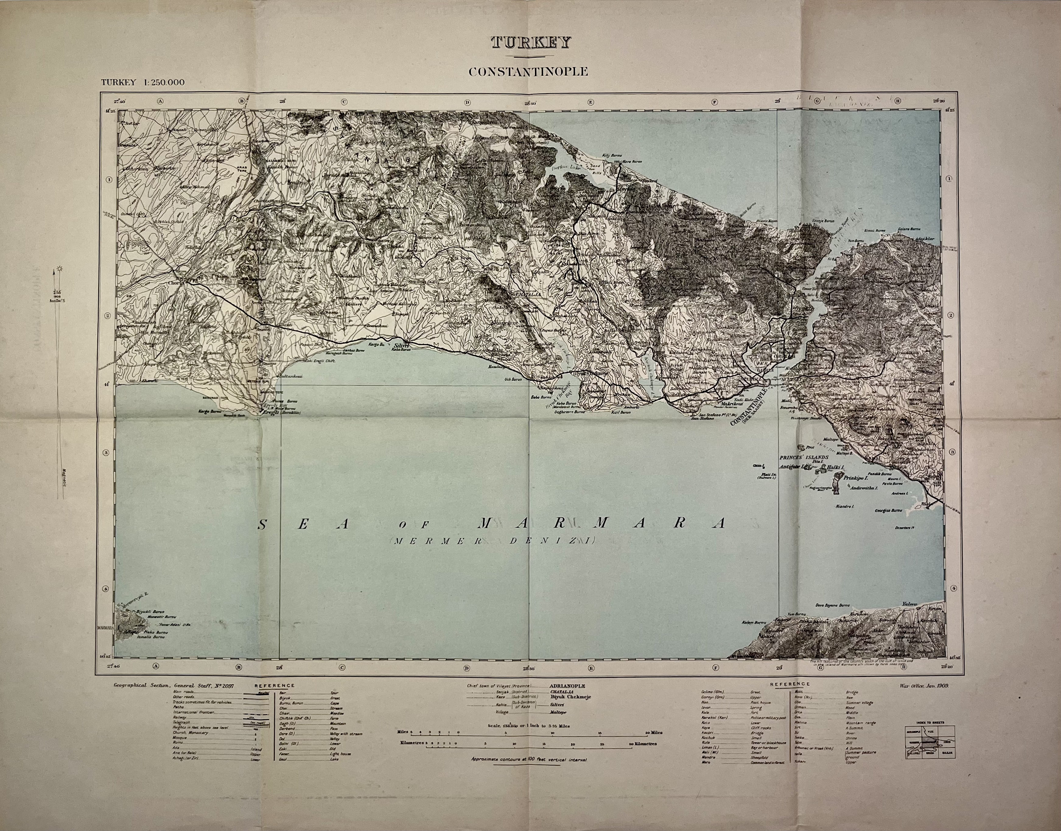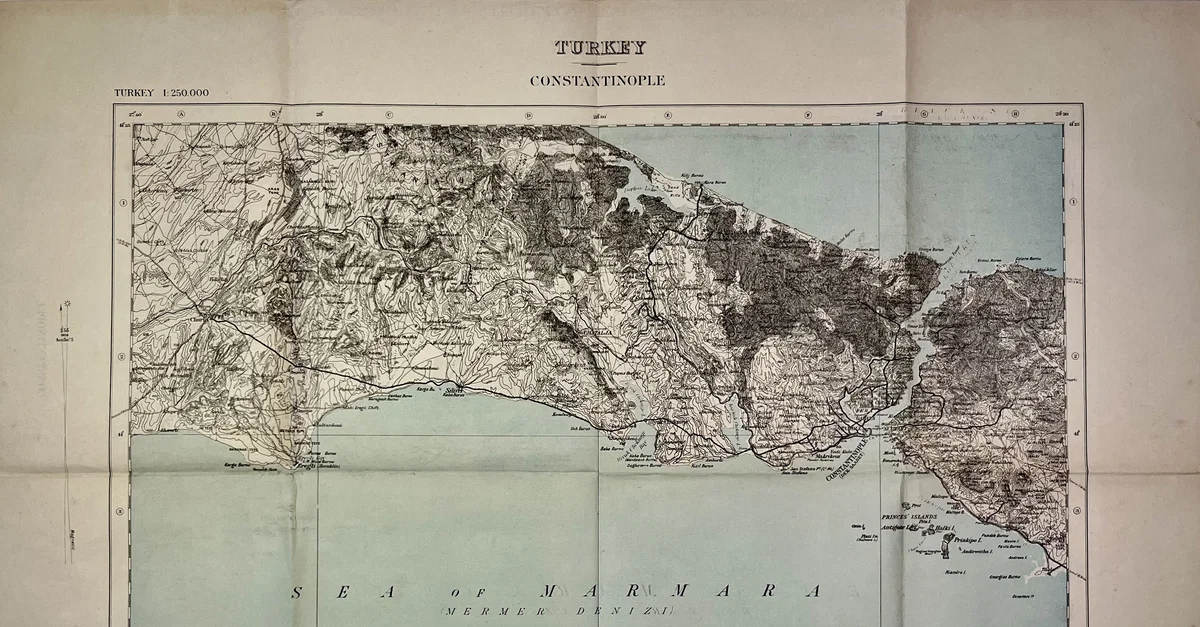 This antique map of Turkey depicts the surroundings of Constantinople (modern-day Istanbul) and was published by the British War Office in 1909. It offers a detailed view of the region at the beginning of the 20th century, reflecting both strategic and geographic considerations of the time. Source: Votre Carte Ancienne – antique maps of Turkey.