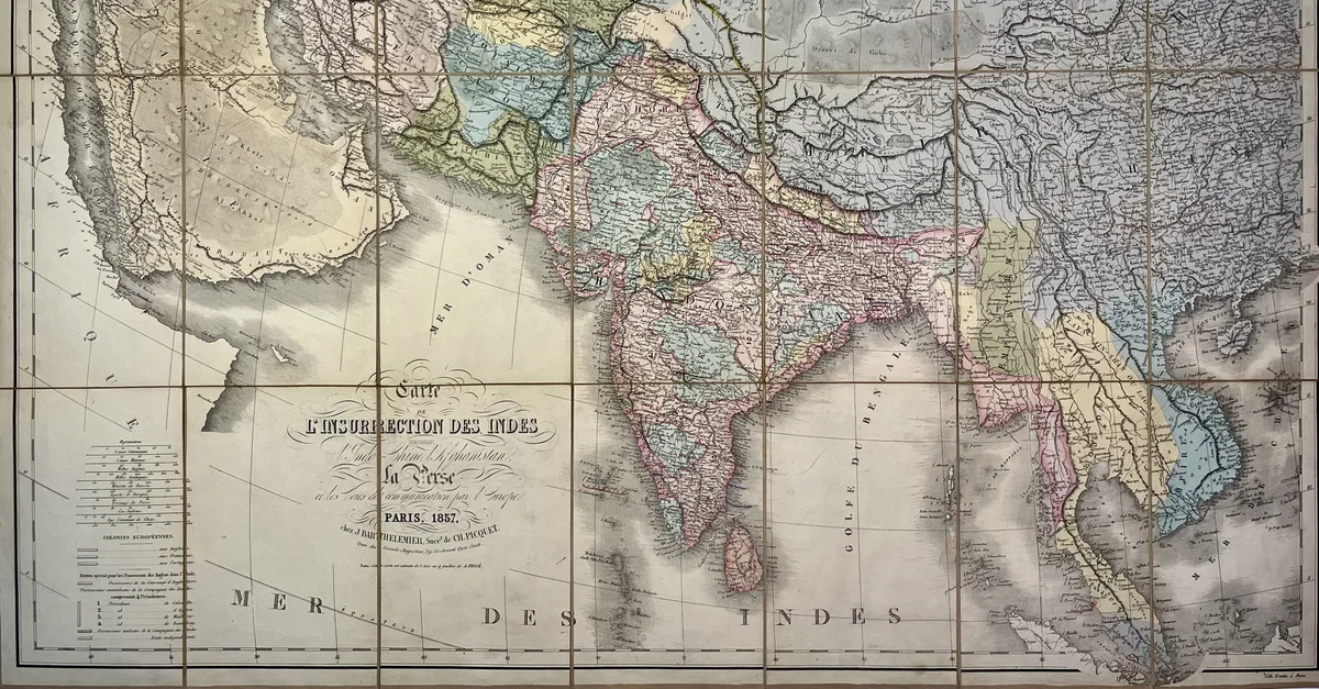 This antique map of India illustrates the Indian Rebellion of 1857, also known as the Sepoy Mutiny. It was published by J. Barthelemier, successor to Ch. Picquet. The map provides a geographical overview of the uprising, reflecting key locations and areas affected during this major event in colonial history. Source: Votre Carte Ancienne – antique maps of India.